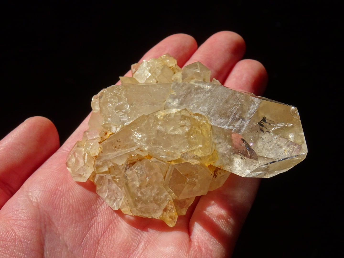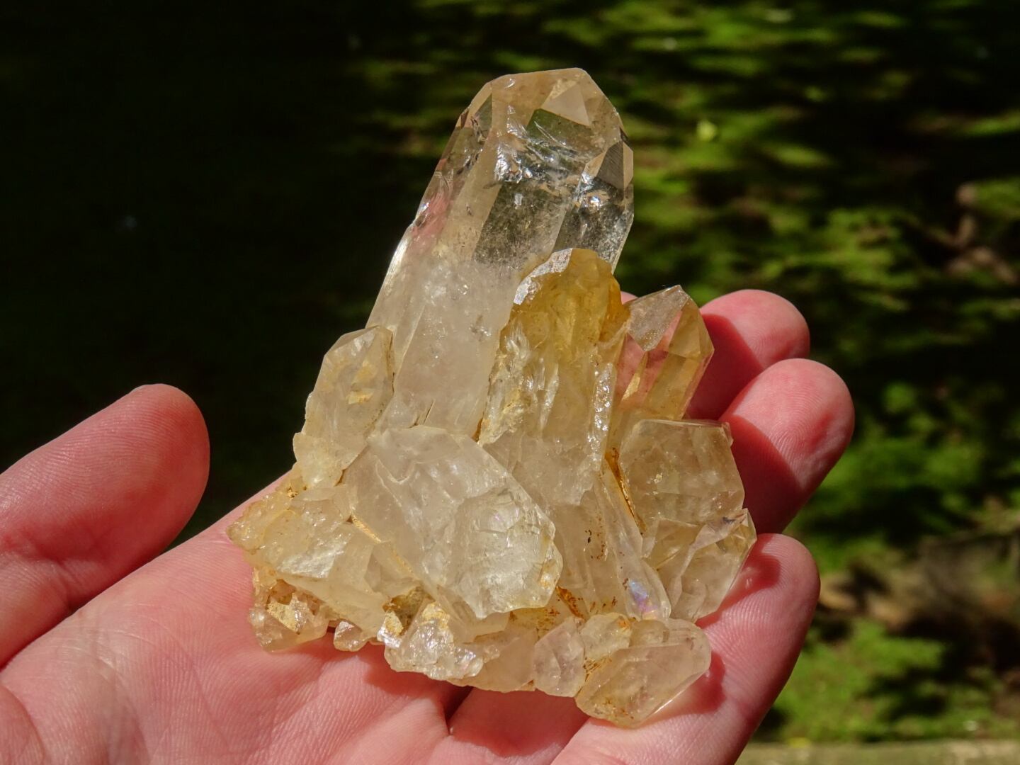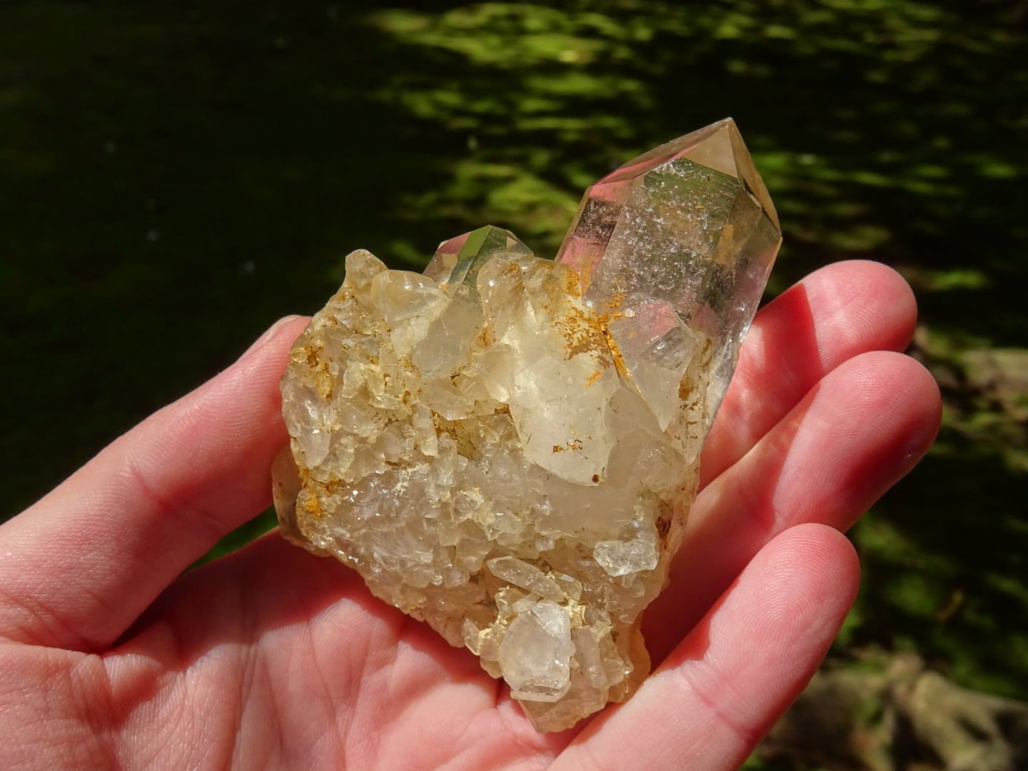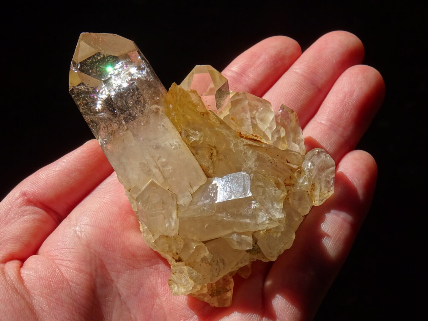 一番大きな結晶は透明度が高く、「ダウ」に近いとても整ったフォルム。角度や採光によってクラックから小さな虹のプリズムが見えます。また、よく見ると左後方のファセットはかなり沢山のレコードキーパーが出ているのがわかります。