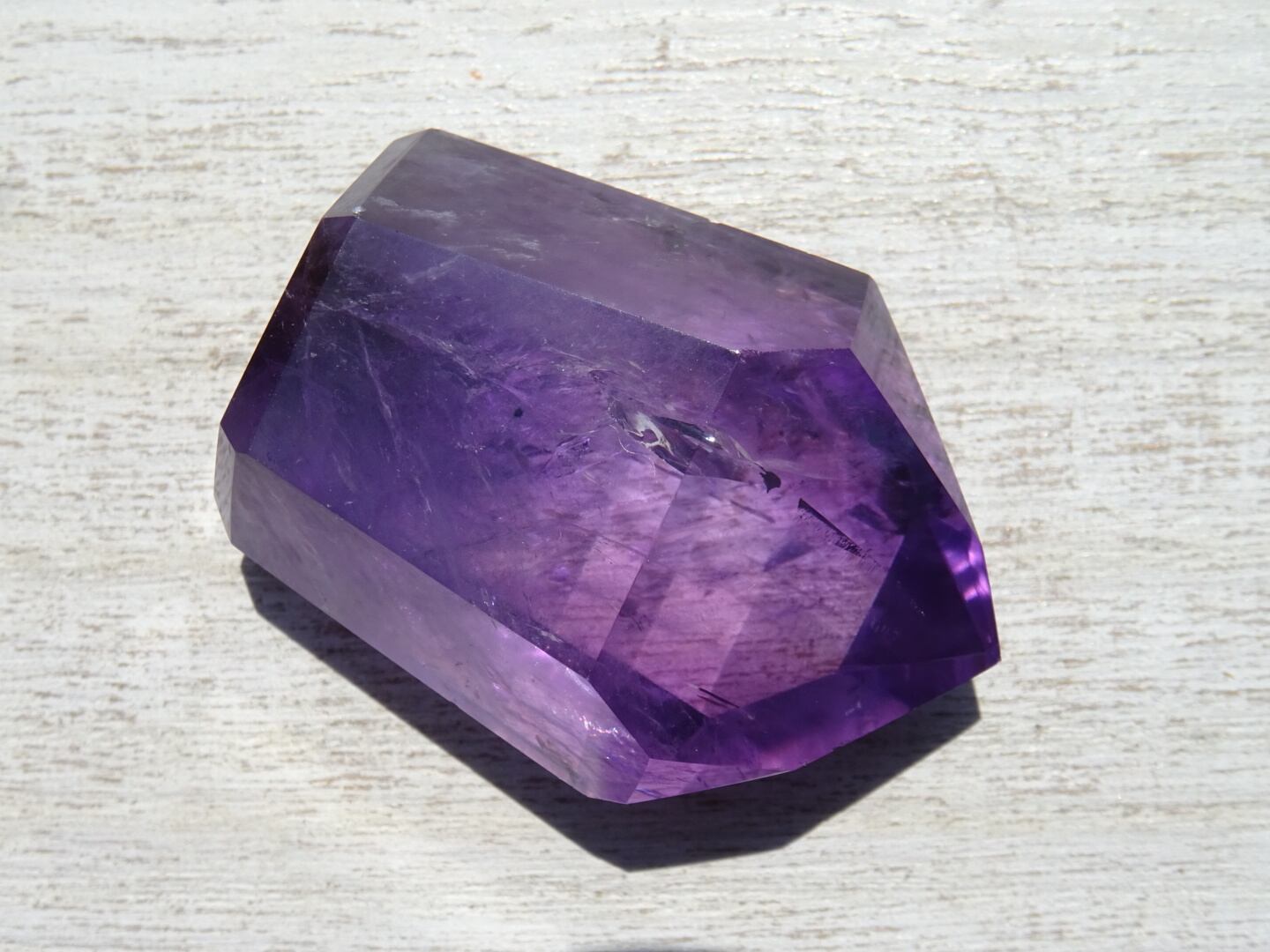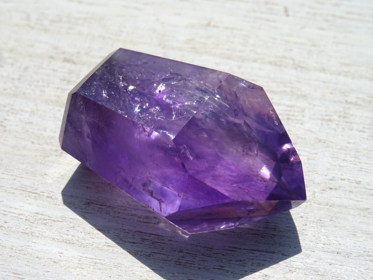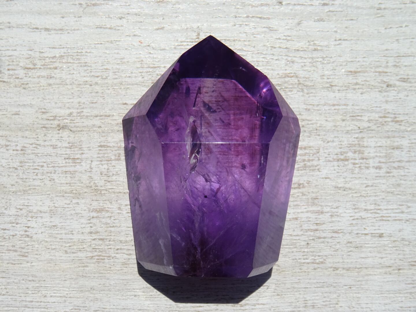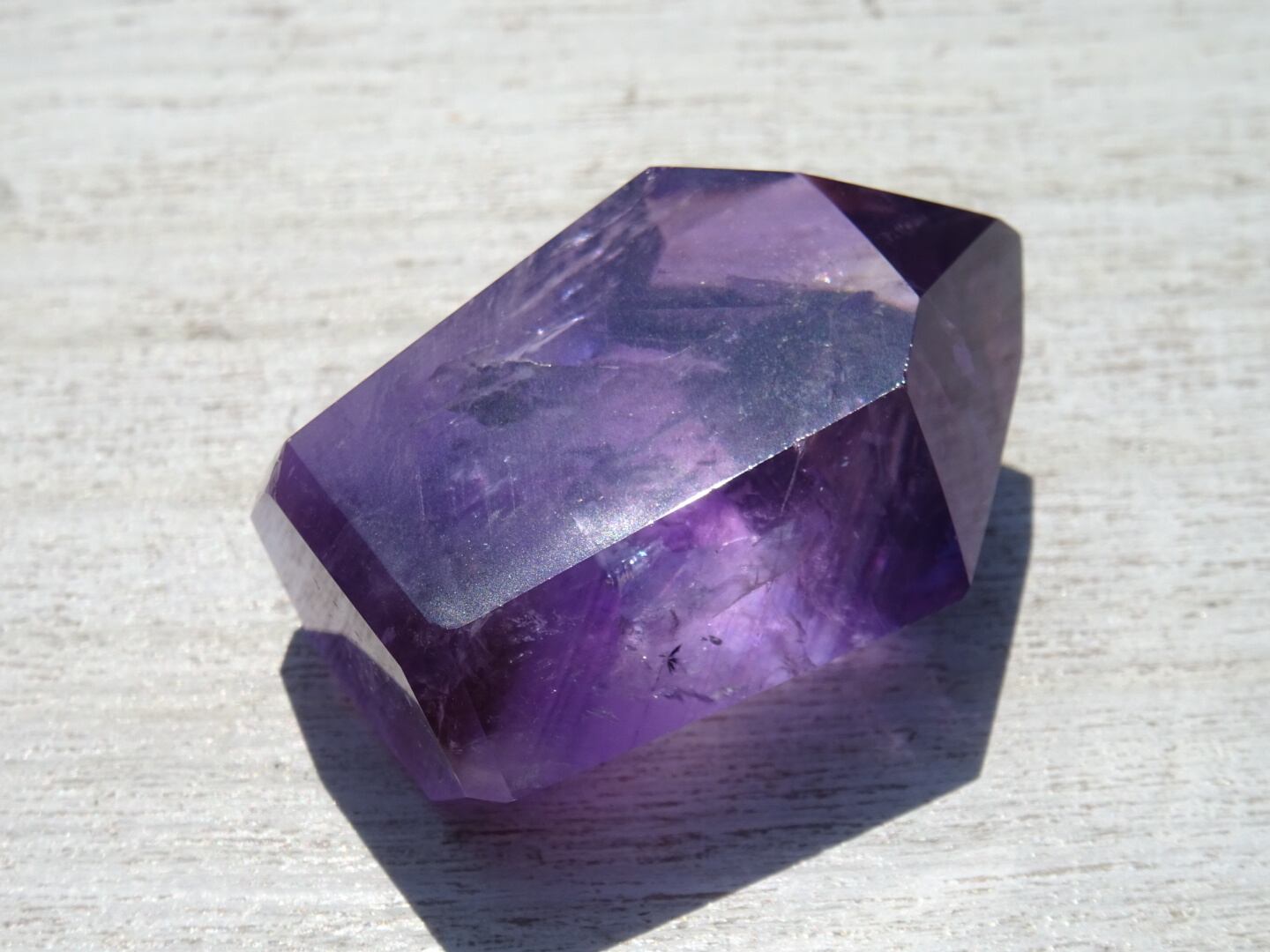 透明感のある濃いパープルが美しく、内側のクラックから虹が出ている部分や、ファントムになっている部分も。