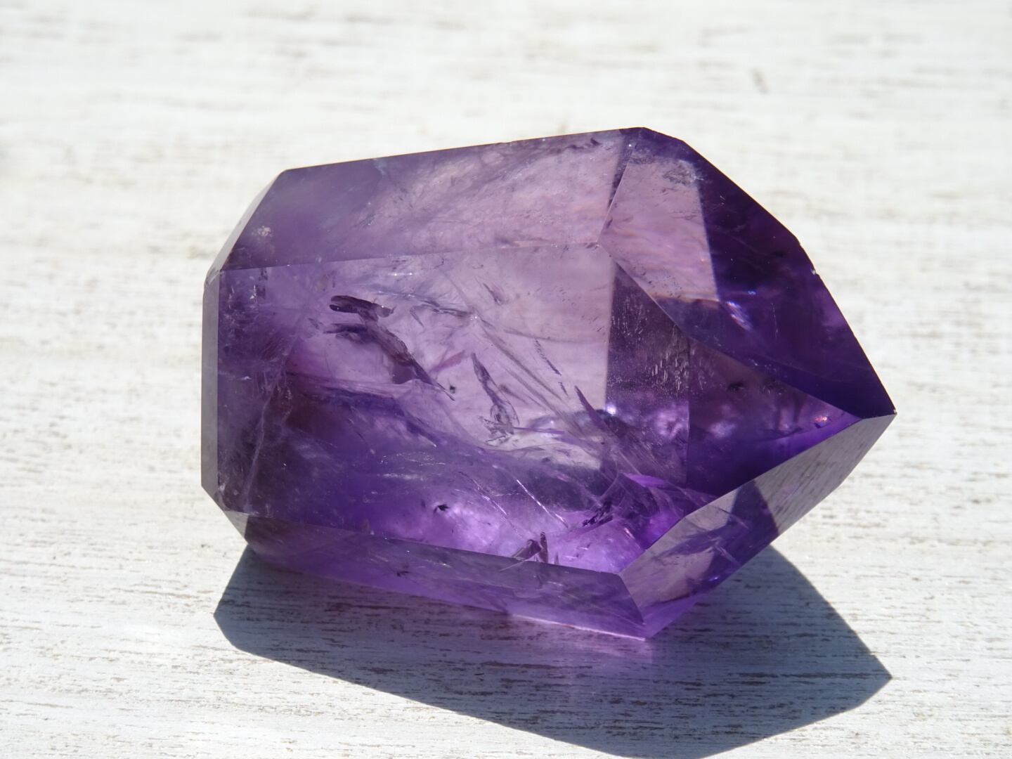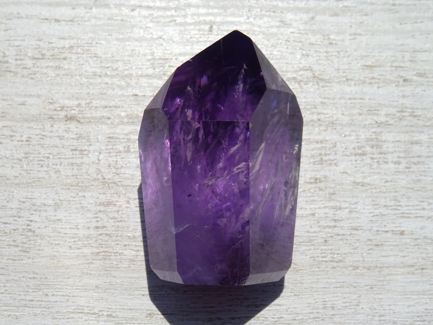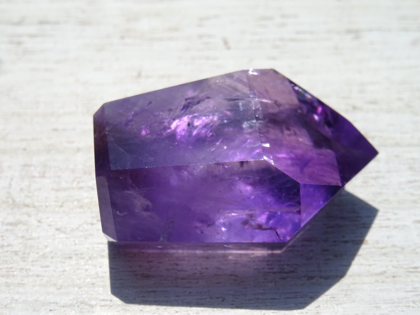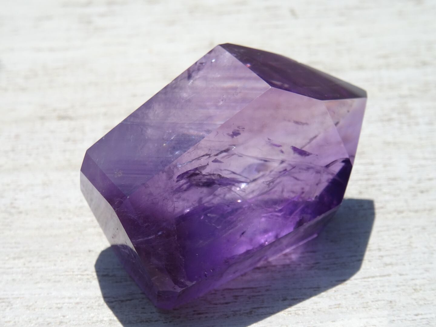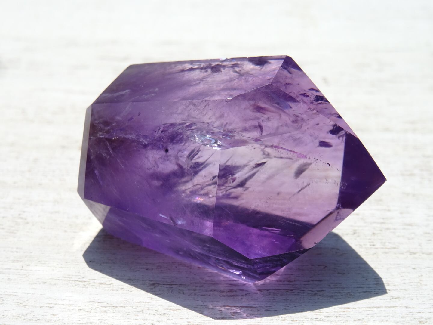透明感のある濃いパープルが美しく、内側のクラックから虹が出ている部分や、ファントムになっている部分も。