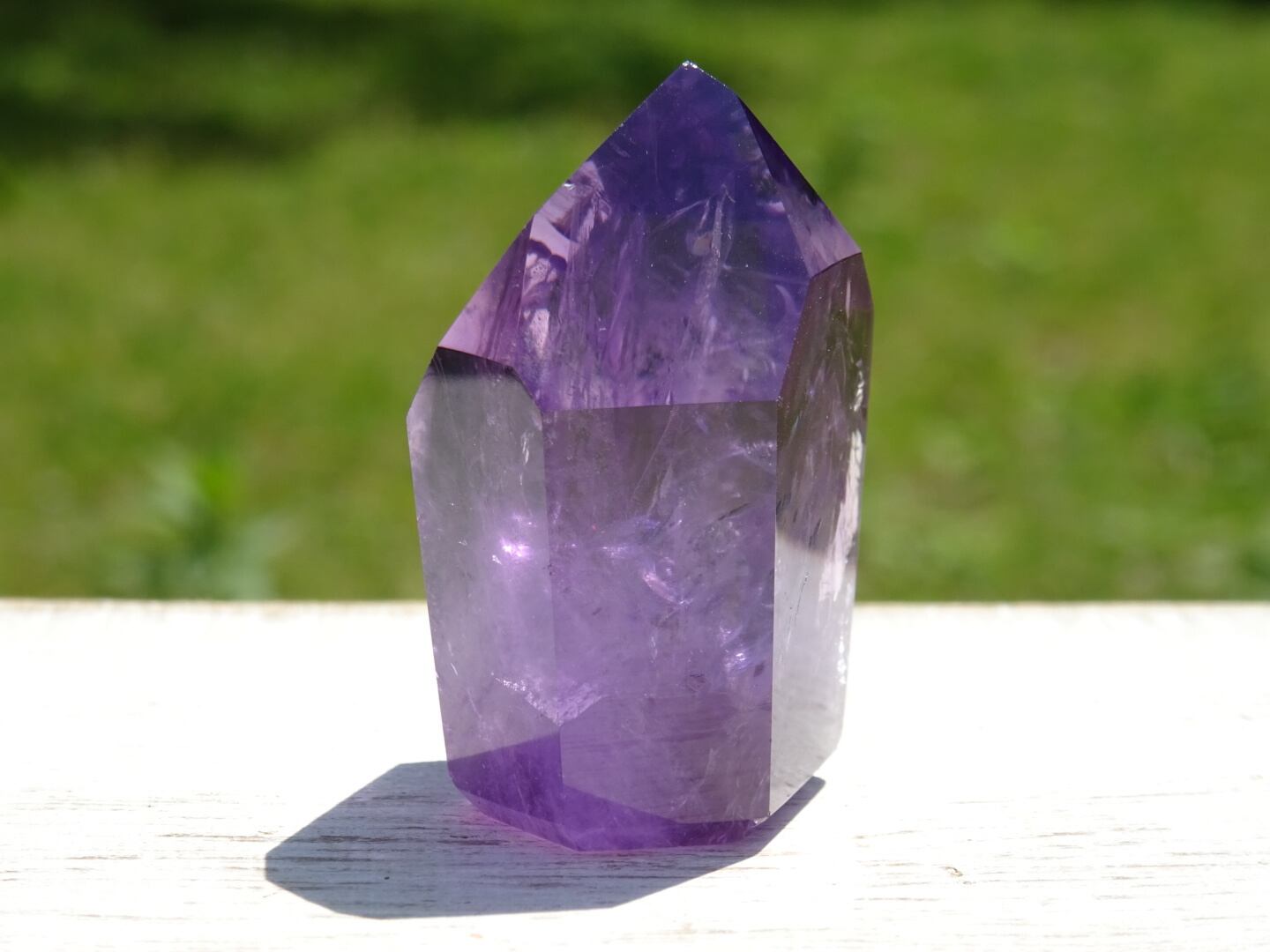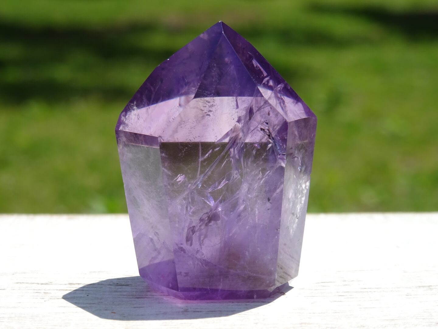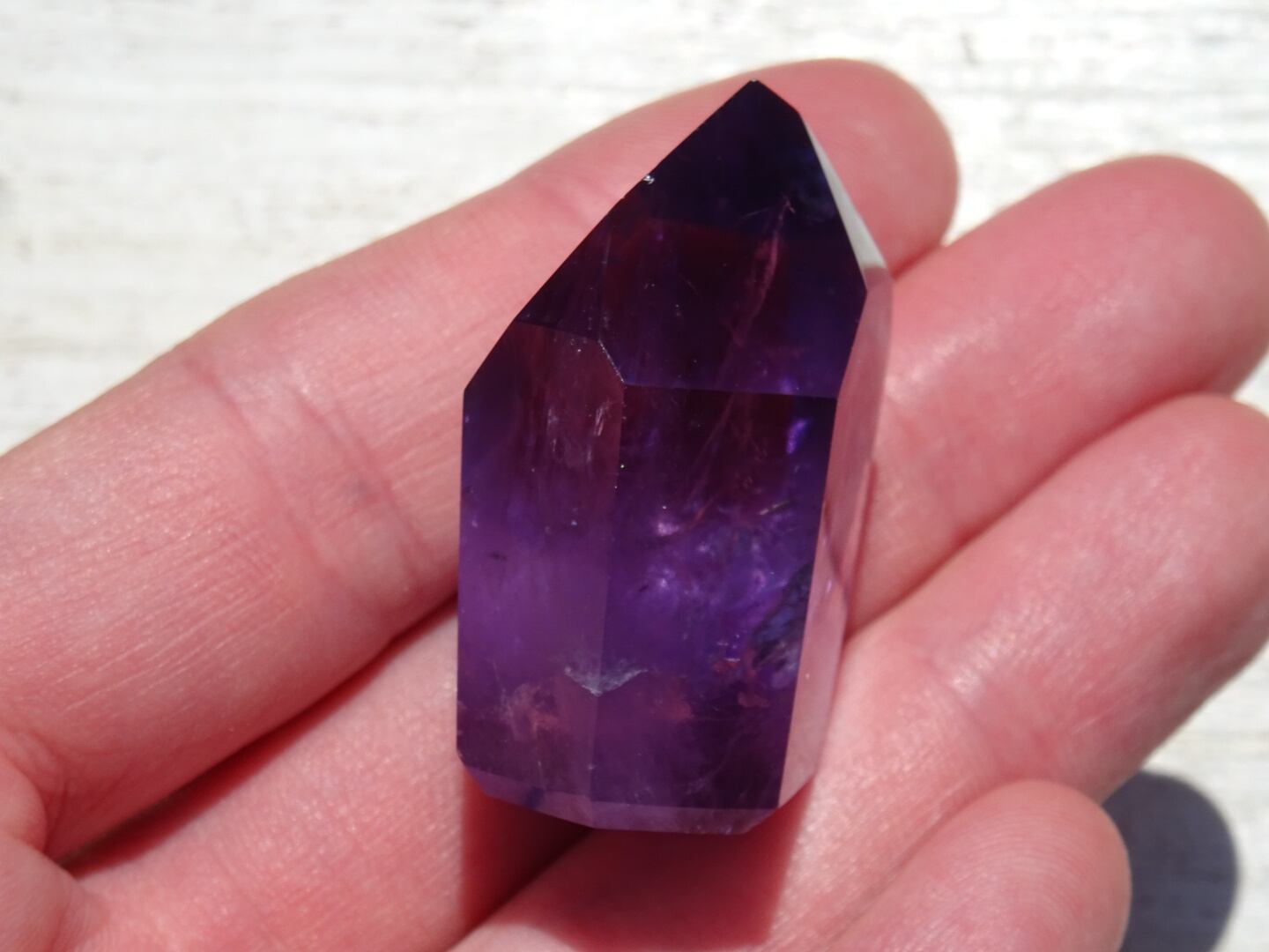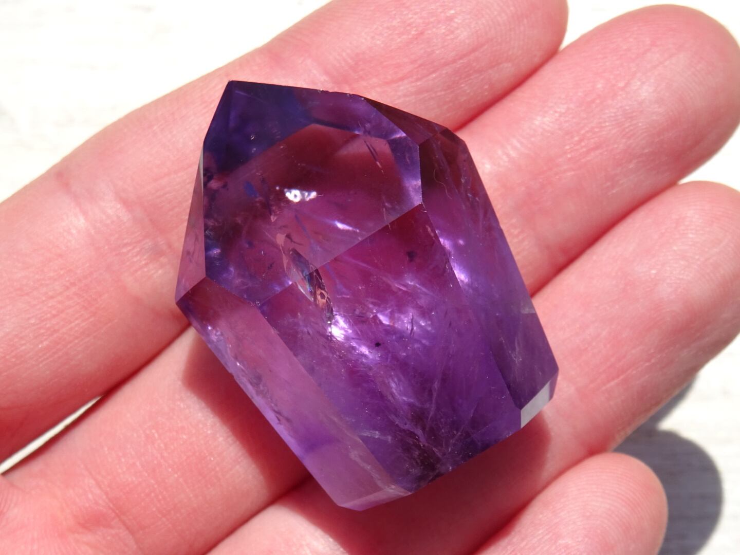 透明感のある濃いパープルが美しく、内側のクラックから虹が出ている部分や、ファントムになっている部分も。