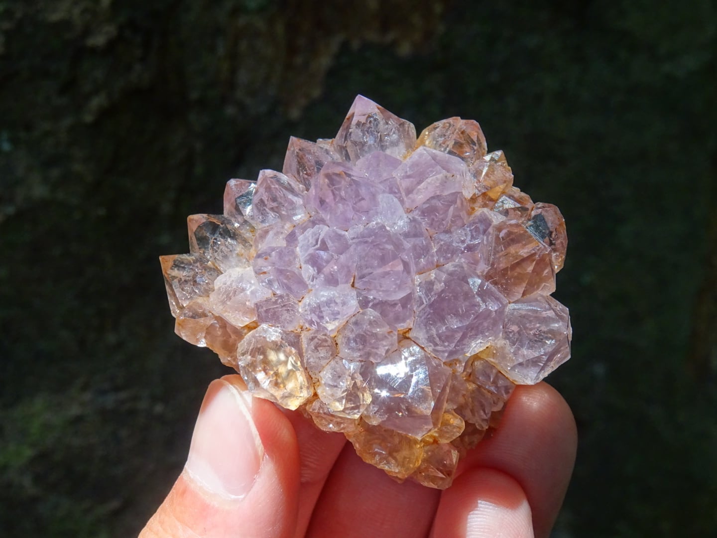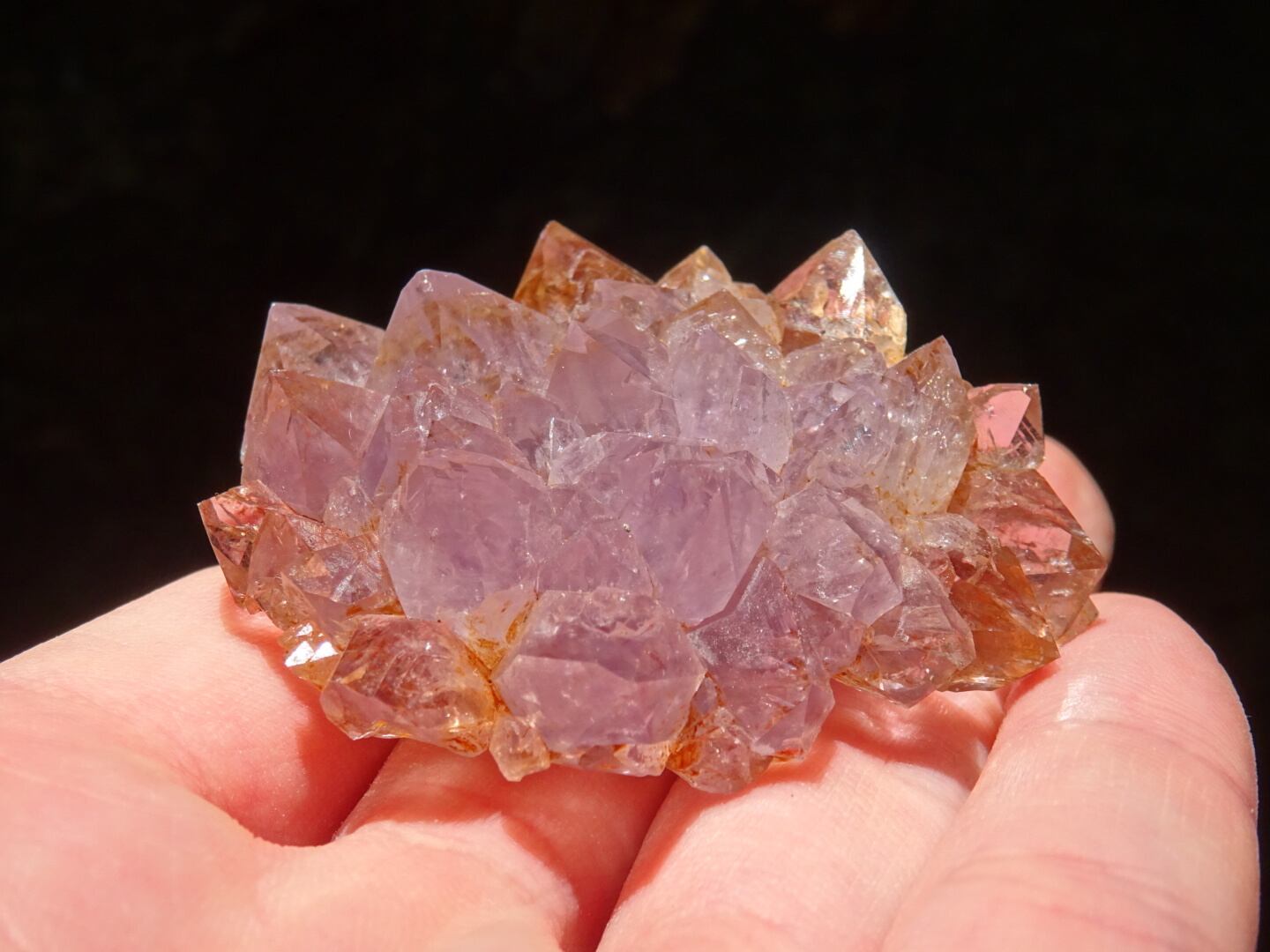 結晶たちは透明感のある淡いパープルで、部分によってはブラウン~シャンパンカラーに染まっています。
