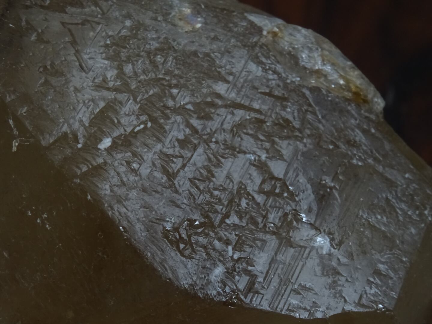 これら外的要因で浸食された痕を残したものを蝕像水晶(エッチドクォーツ)というのですが、トライゴーニックの場合は外側からその▽マークが刻まれたのではなく、元々クリスタルに内在していたものが表面が溶かされたことにより露出したものだといわれています。