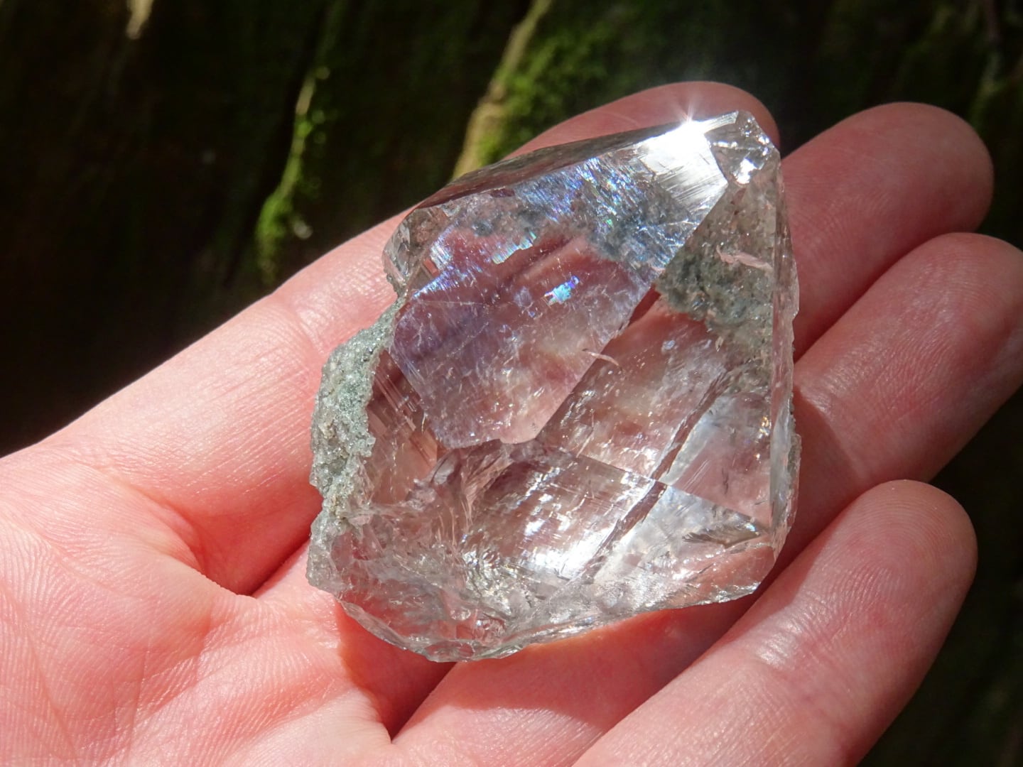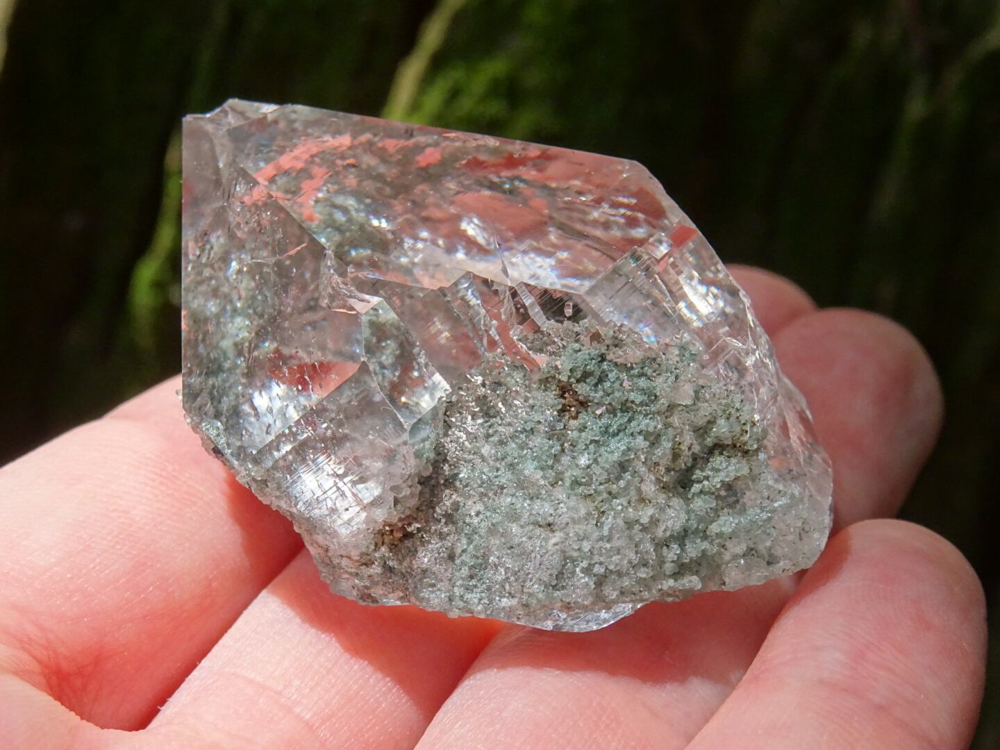 石肌もピッカピッカ、照り照りで、そして面立ちもハンサム。氷のような底部の輝き、そして苔むすようなクローライトの彩り…とにかくすべてが美しいです(笑。フォルムも店主好み)。