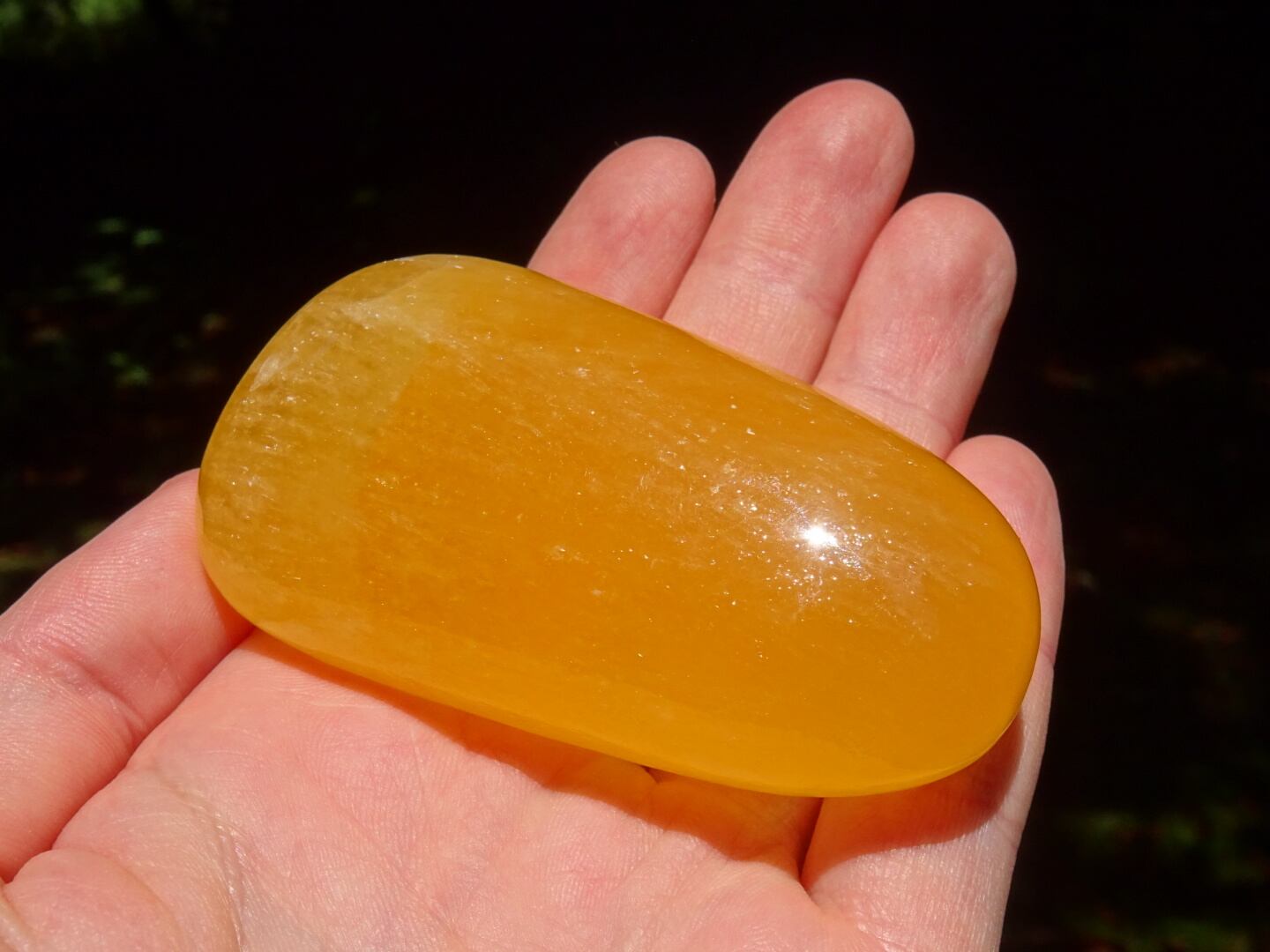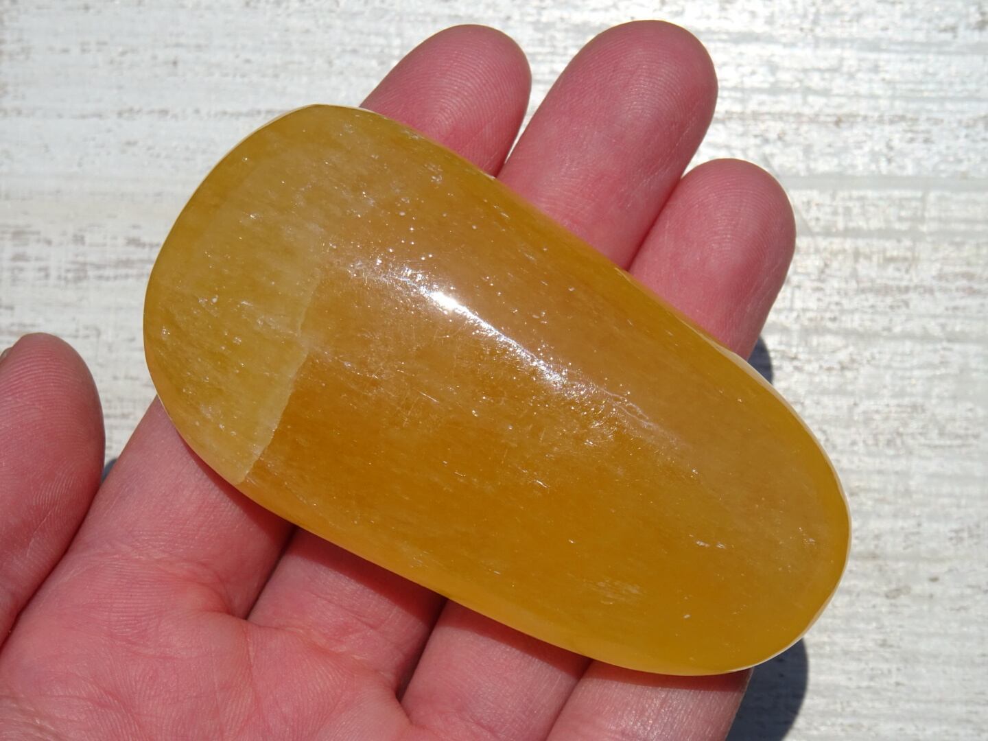 透明感のある濃いめのオレンジでしっかりしたサイズ。ツルツルの石肌が心地いい磨き石です。