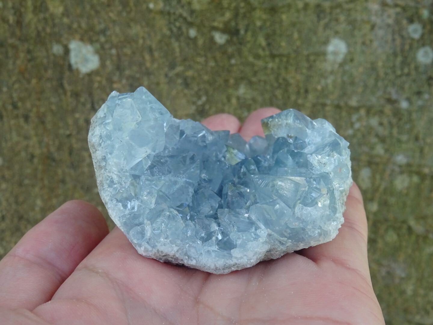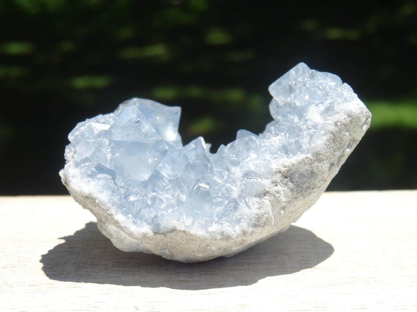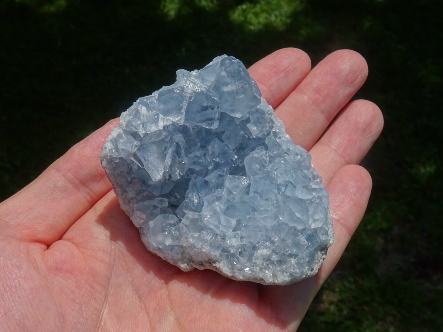白っぽかったり結晶が崩れてしまっているものも多い中、こちらはセレスタイトらしい透明感あるブルーときらきらの光が美しいです。