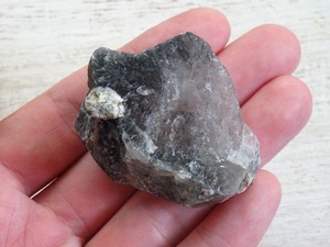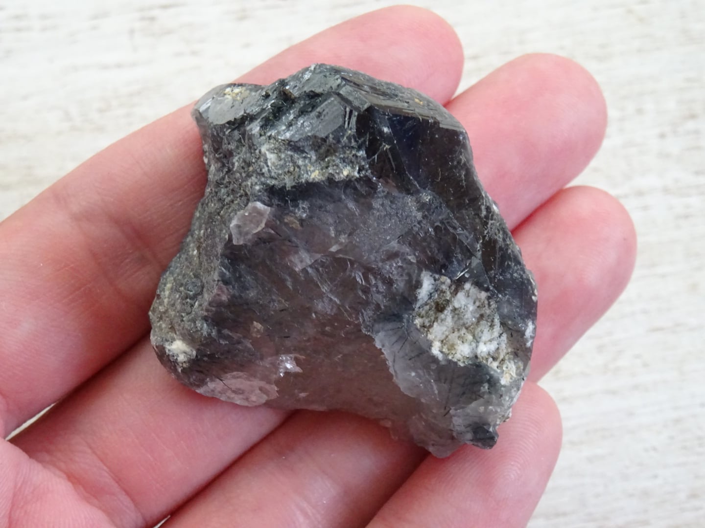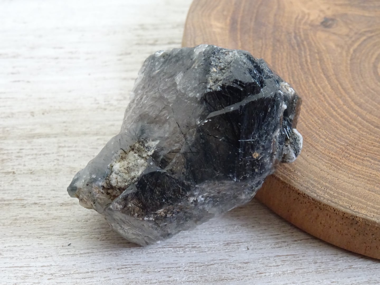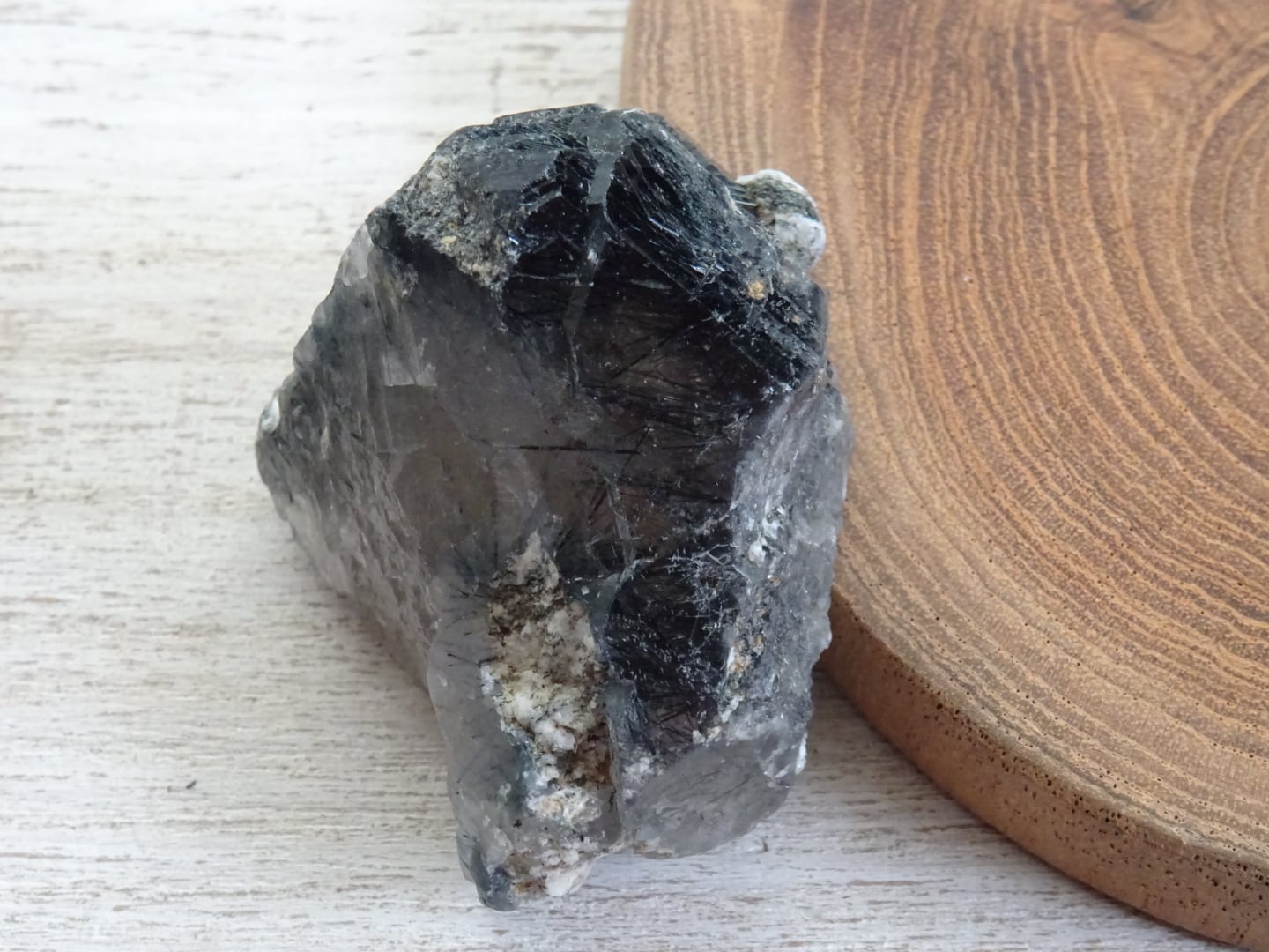 ブルークォーツというには色が少し地味すぎるな…という印象ですが、他の2点と異なるのはリーベカイトの針がとても太くしっかりと結晶しているという点で、黒っぽく見えています。