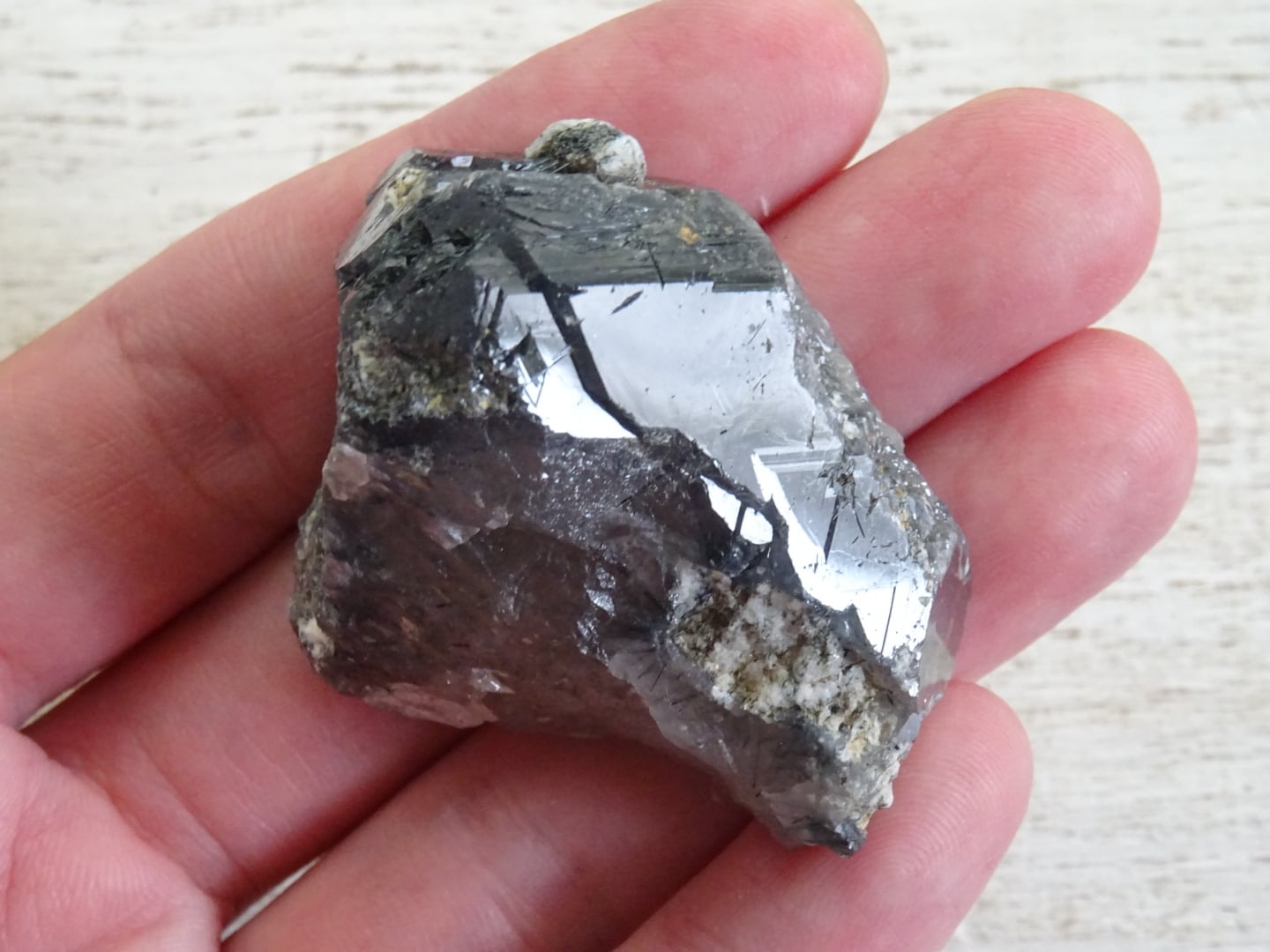 黒っぽくて少しわかりづらいのですが、光に透かすとグリーンの太い針をたくさん内包しているのがわかります。また、わずかに残っているファセットには大きな3角形のレコードキーパーが2つ出ています。