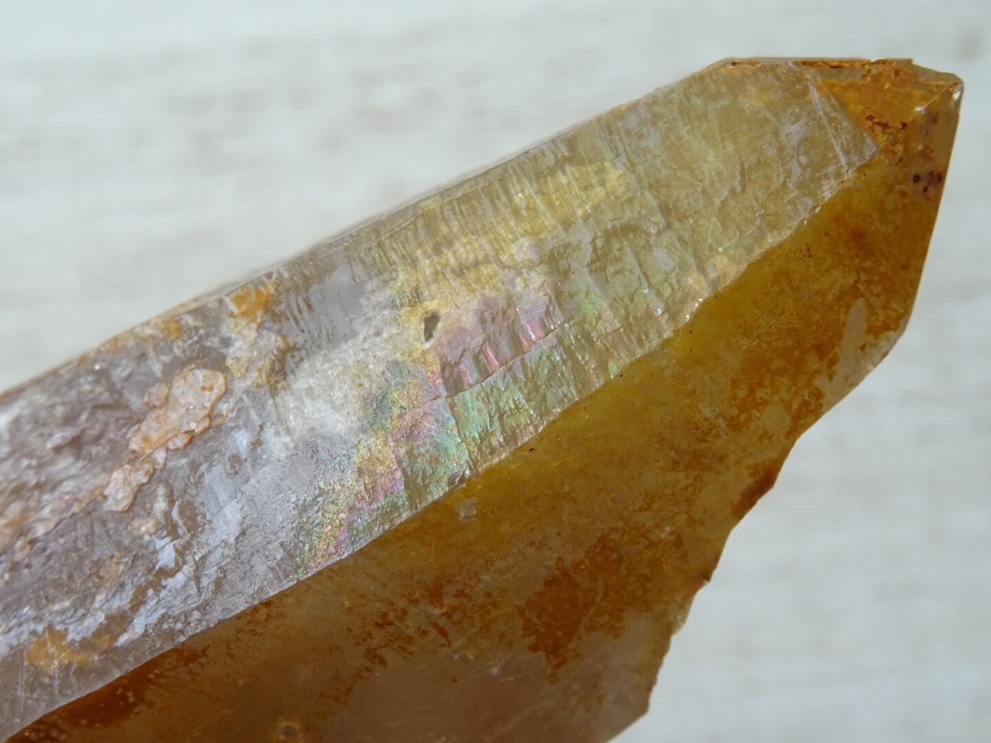 リモナイトの被膜によって天然のレインボーが出ているレインボースキンになっています。それほどはっきりと出ている訳ではないのですが、特にイエローが濃く出ている2面に確認できます。