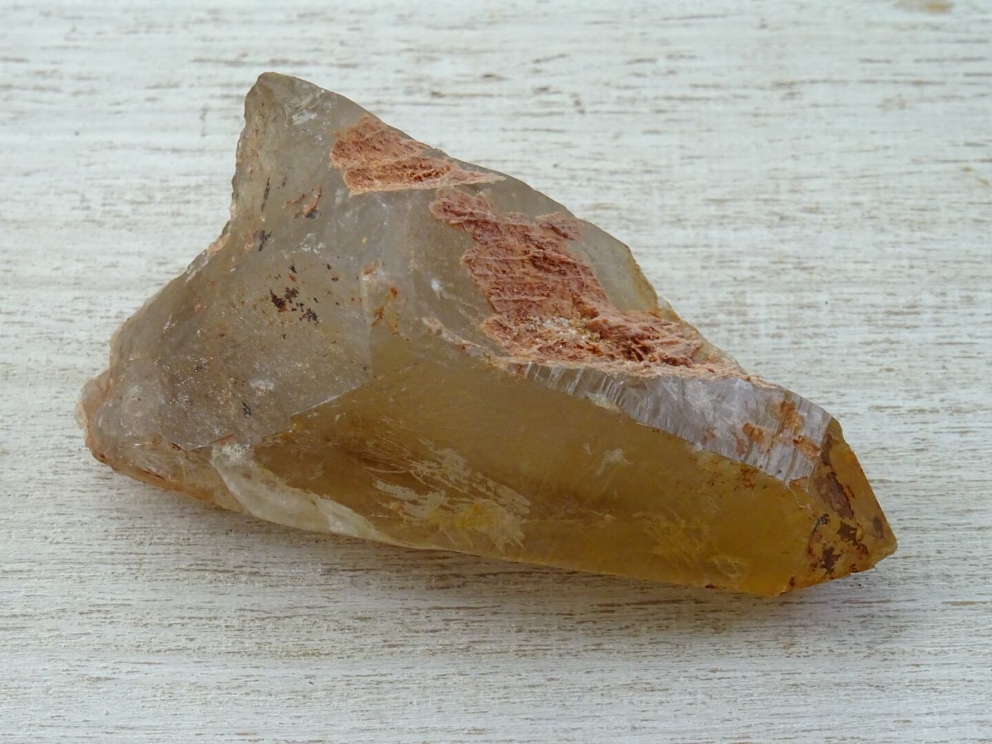 仕入れ元の説明では「スモーキーシトリン」となっているのですが、濃い黄色になって見えているのは、主に表面に付着しているリモナイトゆえ。でも、水晶そのものの色味もやはりうっすら色づいているので、やはりスモーキーシトリンなのだと思います。