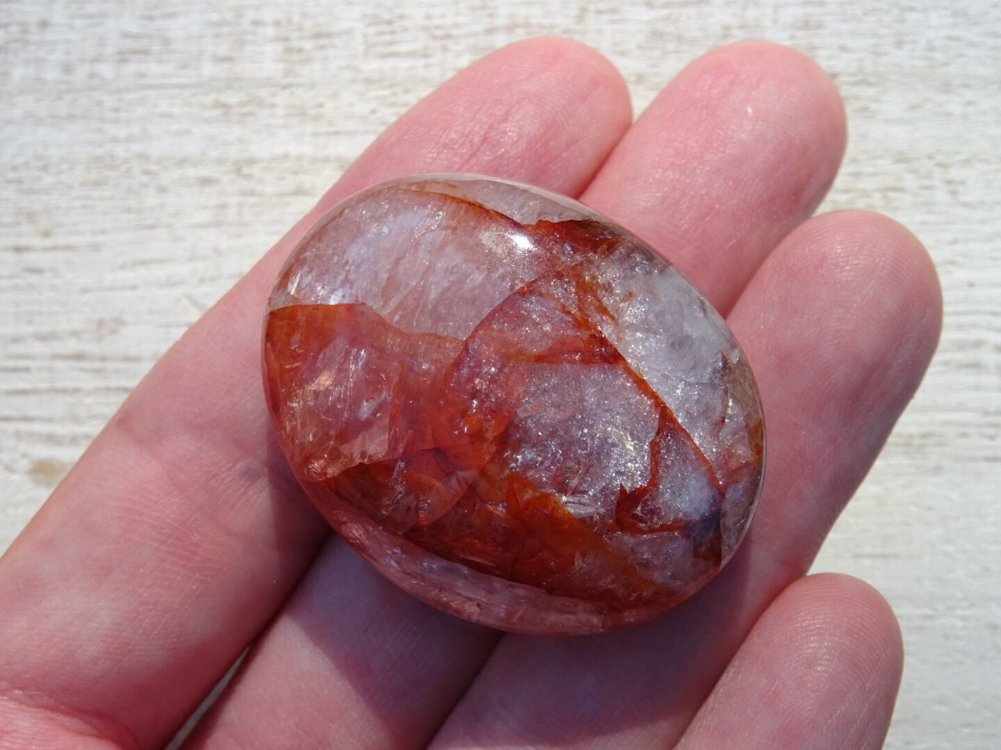 鮮やかなレッドヘマタイト(鉄分)を内包したクォーツの磨き石です。