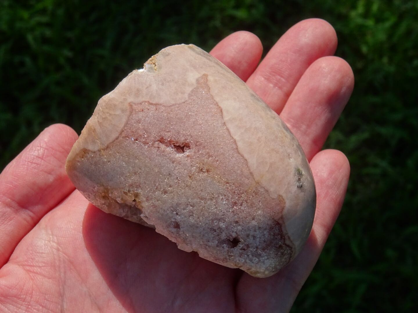 こころのなかにある柔かさ、やさしいものを想い起させてくれるような、和みの石。平和とほほえみを向けるようなジオード。エッグのようなトップや、なだらかな後ろ姿もかわいいです。