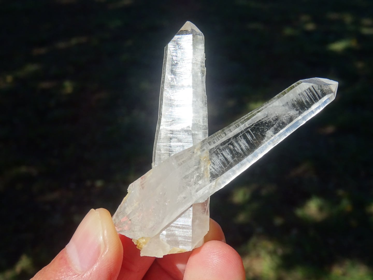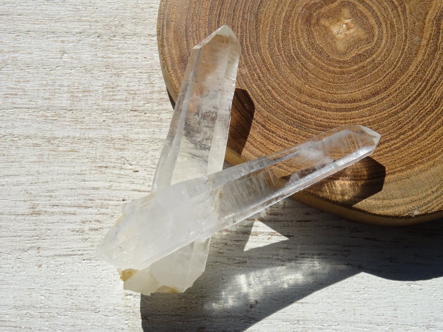こちらはダブルポイントで交差した姿が本当に美しく、佇まいとしてはコロンビア水晶のようにシャープなのですが、それでもやはり優し気な響き。