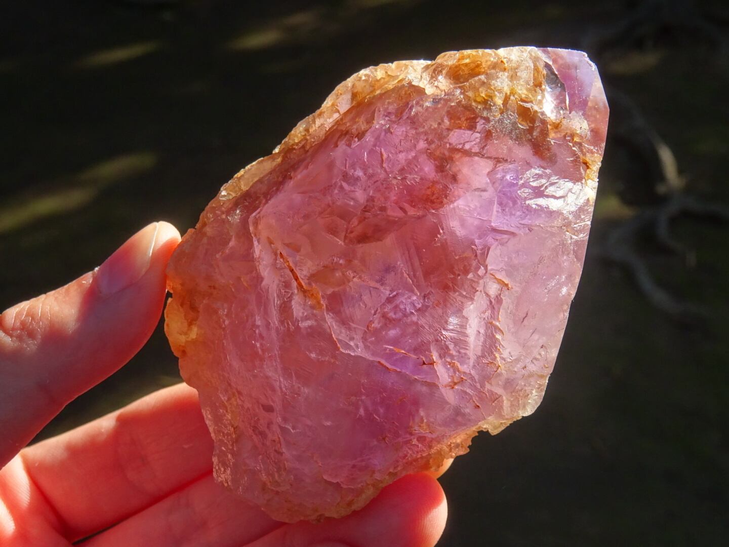 それがやがて紫に色づき、高温の熱水がザクザクと表面を溶かし始め、さらにリモナイトが浸蝕するようにそれを染めたもの…アメジストが溶かされた姿は、どこかロマンがありますね。