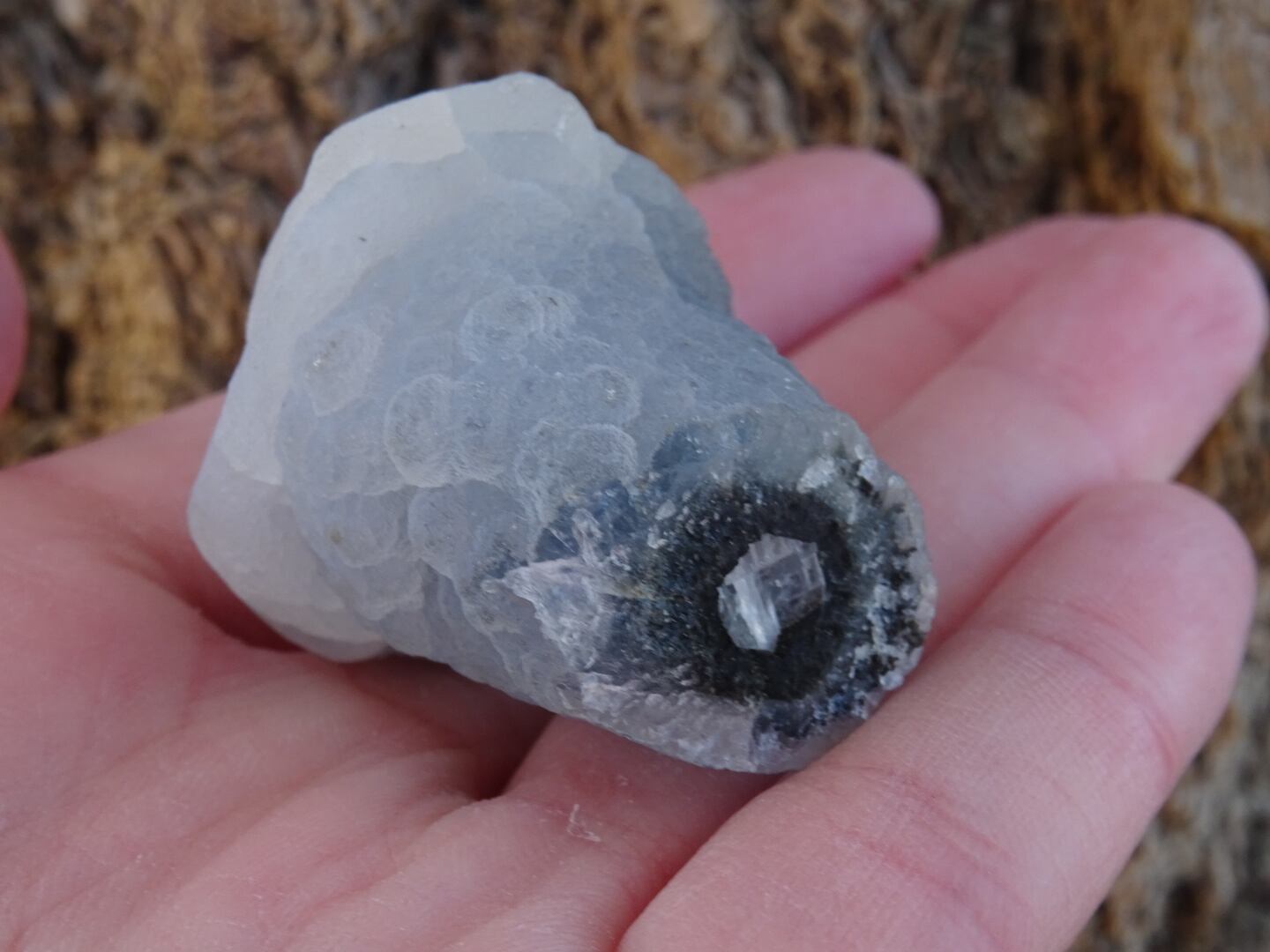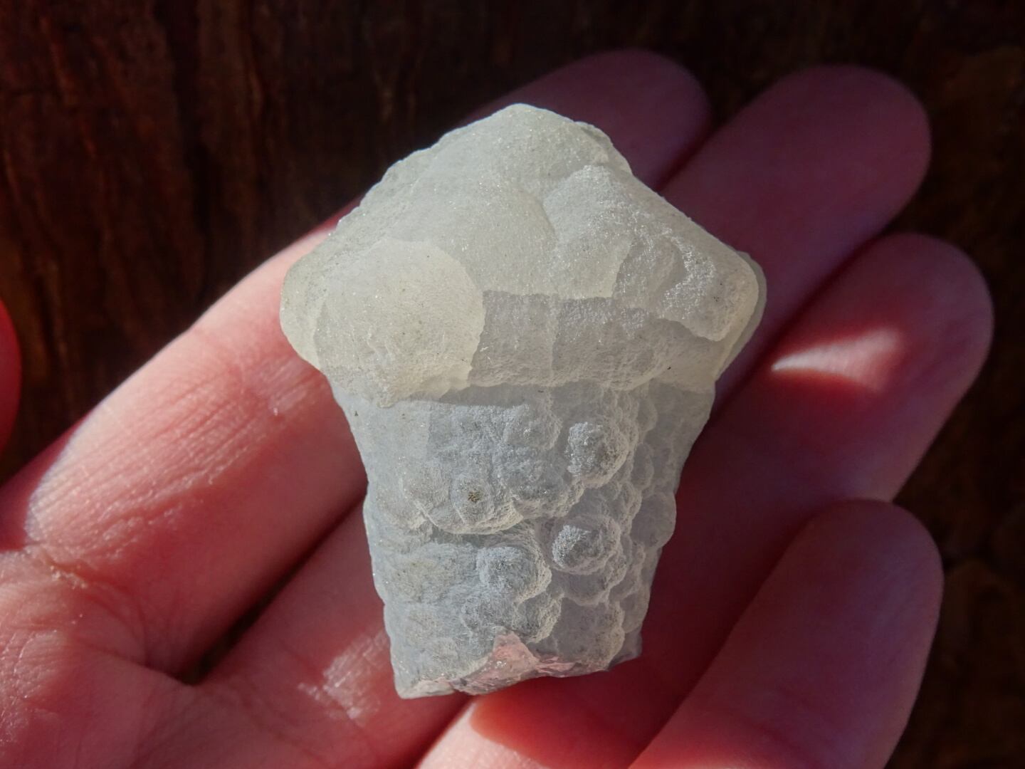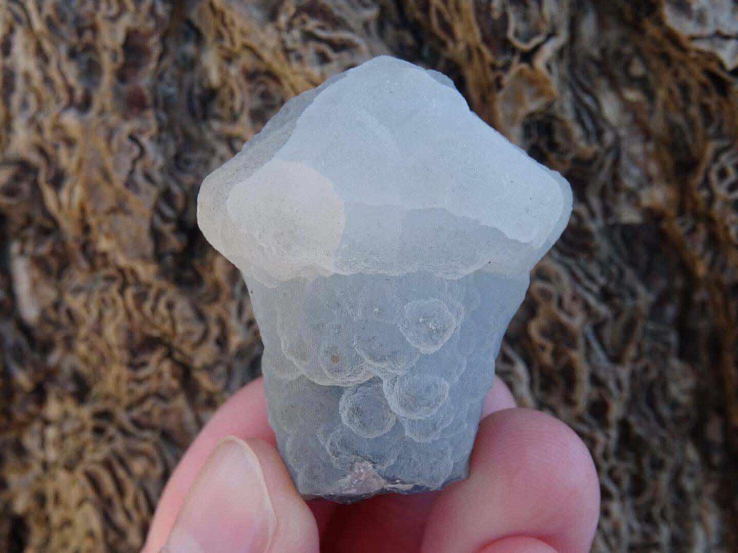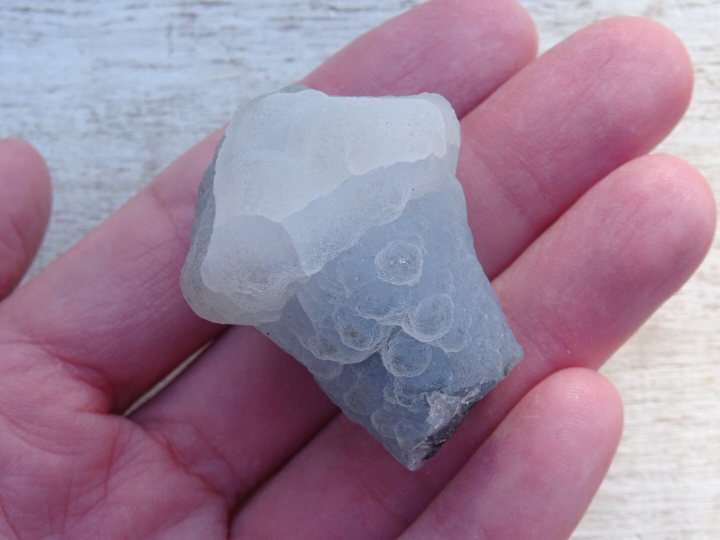 カルセドニーは微細なクォーツが寄り集まったものでさまざまなバリエーションがありますが…こちらはなんともユニークな姿で一目惚れ。