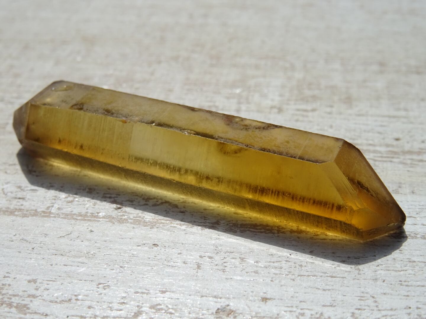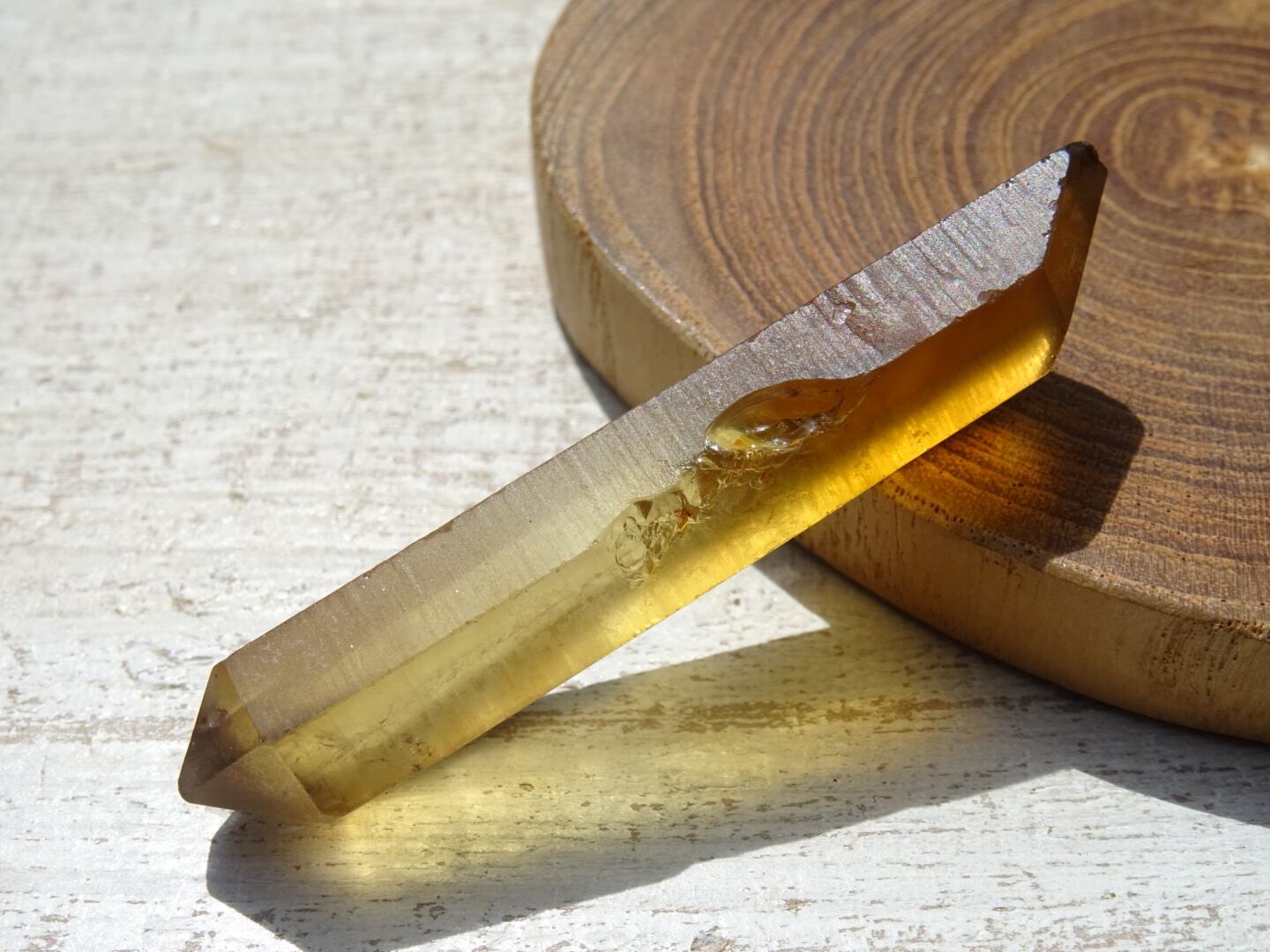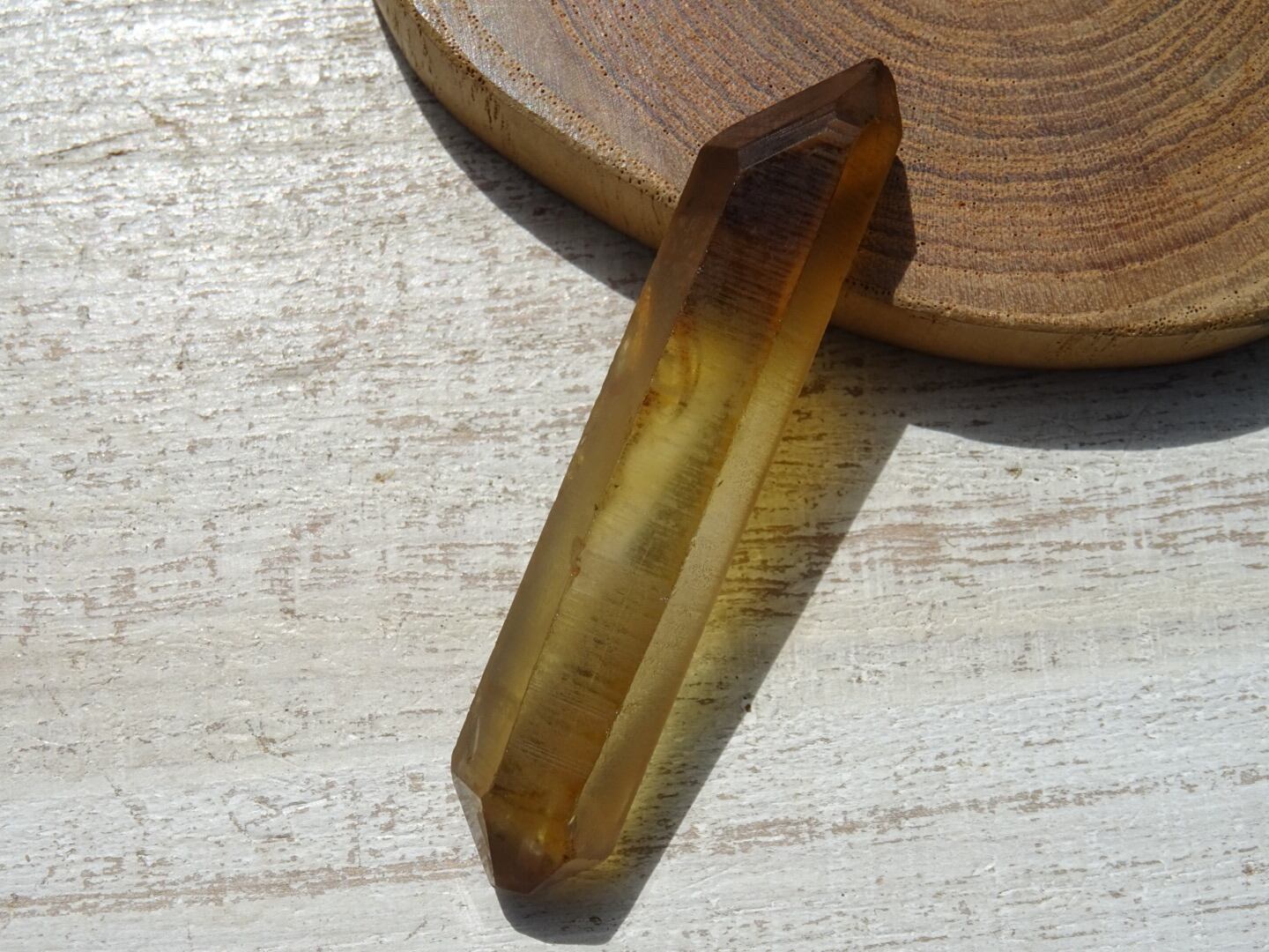 シトリンでダブルターミネーション、、というのも珍しいなと思うのですが(形状もとても綺麗)細長の石肌に反射するゴールドがかった光も、と~っても美しいです。