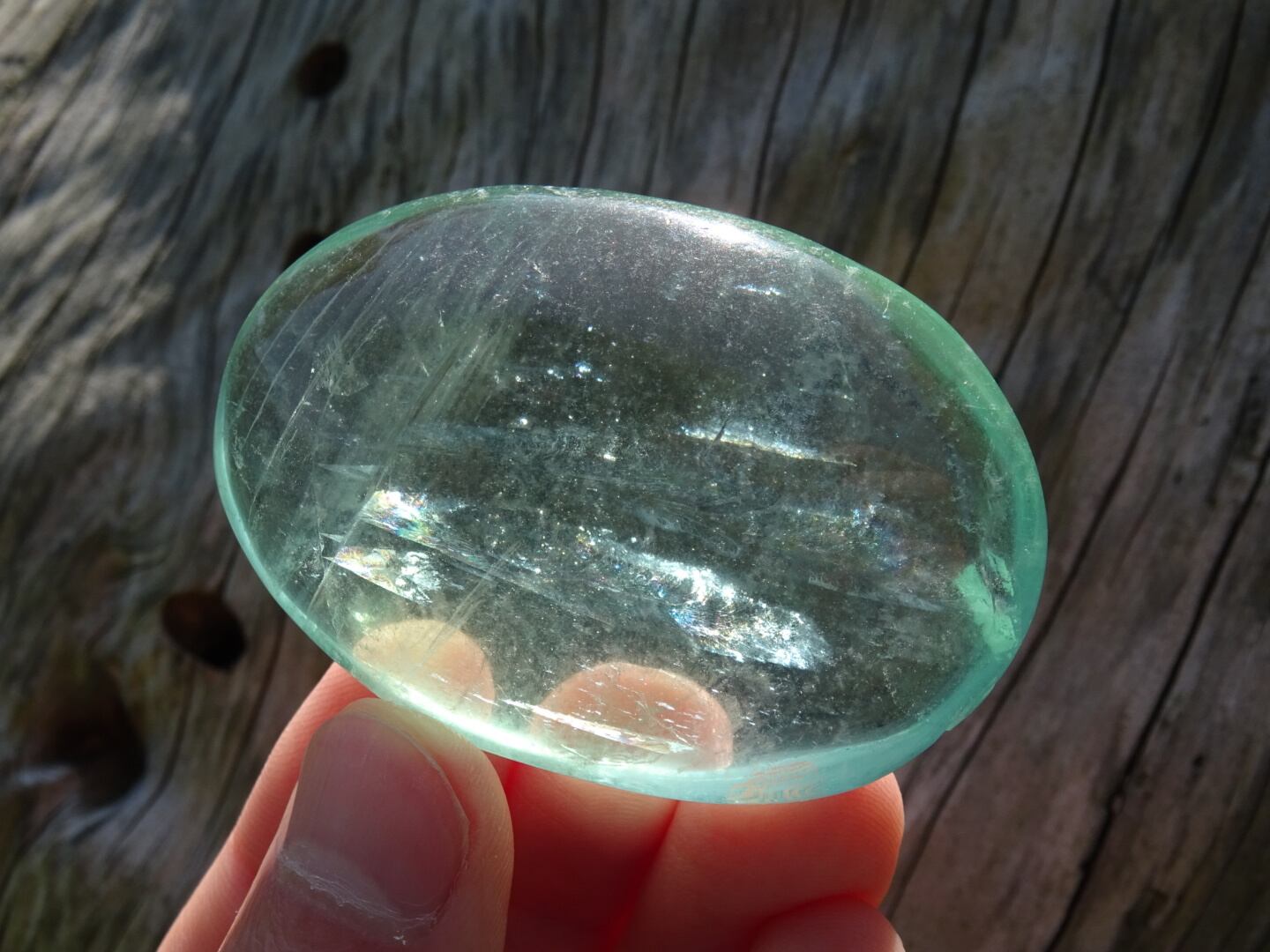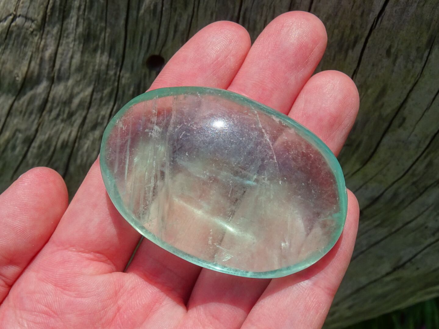 余談になってしまいますが、私物のフローライトのタンブルで同じようなものがあって、彼ははじめクラックはあったものの虹はどこにもありませんでした。けれどそのうち、クラックを伸ばして今ではどこの面から見てもびっしりの美しい虹を出してくれています。