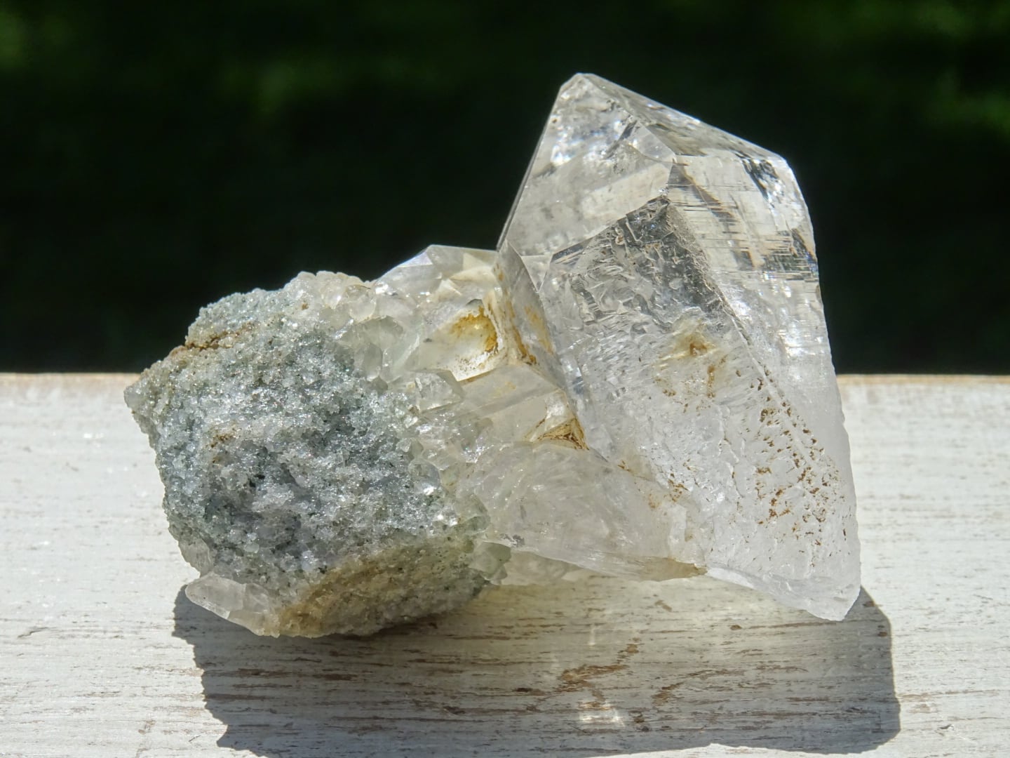 右側でマザーストーンとなっている大きな結晶は、透明感も石肌の艶もあり、ヒマラヤ水晶らしい「光が零れている」感があります。中央のミニ結晶たちは本当にマザーストーンと緑の島をつなでいる橋のよう。にぎやかに育っていてかわいいです。