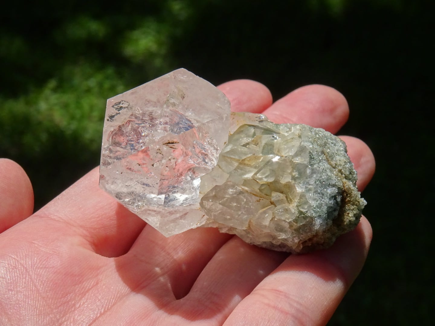 全体的に美しいのですが、ポイントは、水晶の橋がかかって繋がった小島のような、グリーンの成分。おそらくクローライト(緑泥石)だと思うのですが、やや青みがかった緑色とクリアな水晶の調和した世界にとても惹かれました。