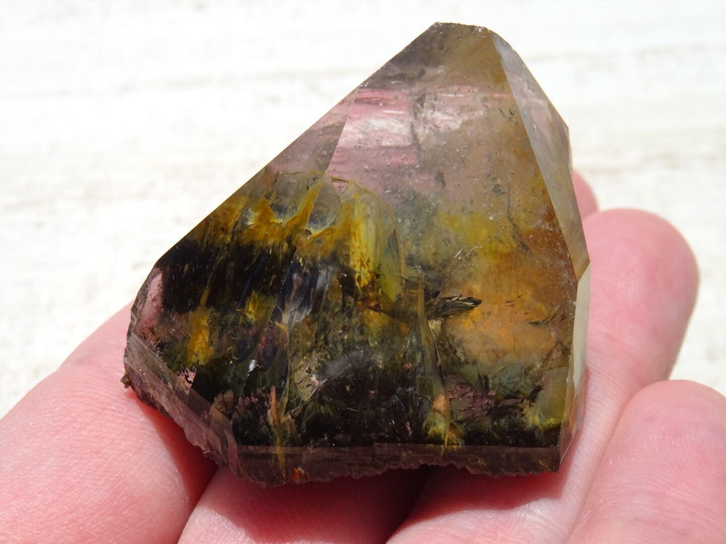 こちらはびっくりしてしまうくらいにファセットがテリテリ・ツヤツヤな1点で(まるで作りもののよう)、+店主が「Temple Crystal(寺院の水晶)」と呼んでいる、柱面が少なくファセットが開けている美しいシルエットをした結晶です。