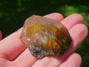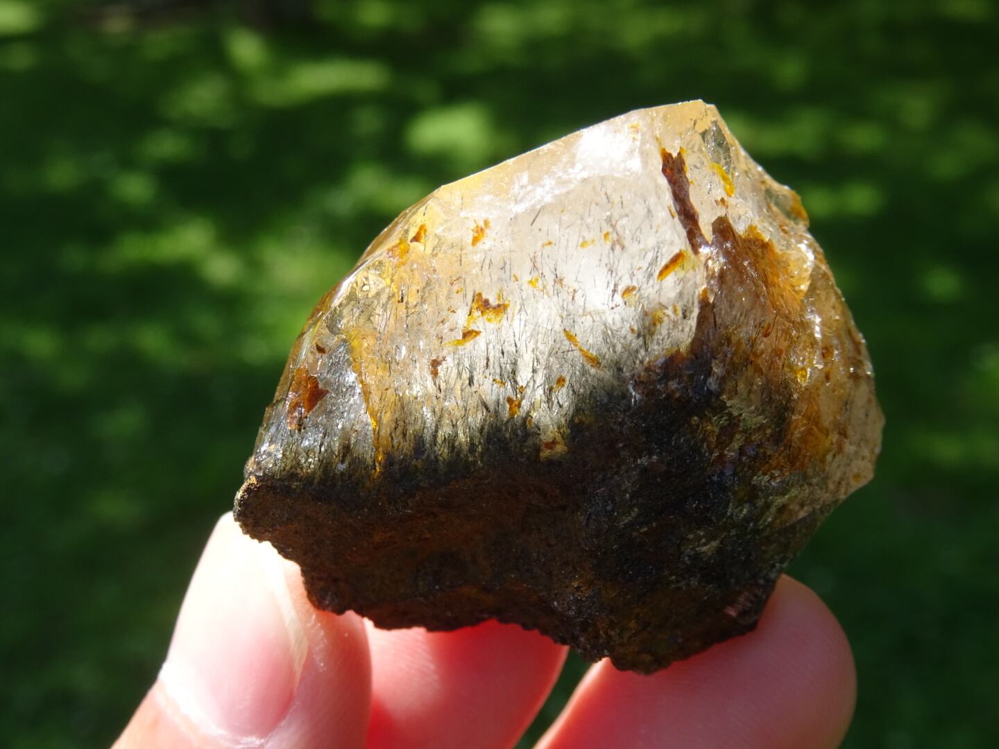 +根本の「ヒゲ」のようなギザギザから上へ伸びているブラックトルマリンの針と、リモナイトの蜜のようなゴールドがと~っても素敵です。クラックからは虹が出ている部分も。