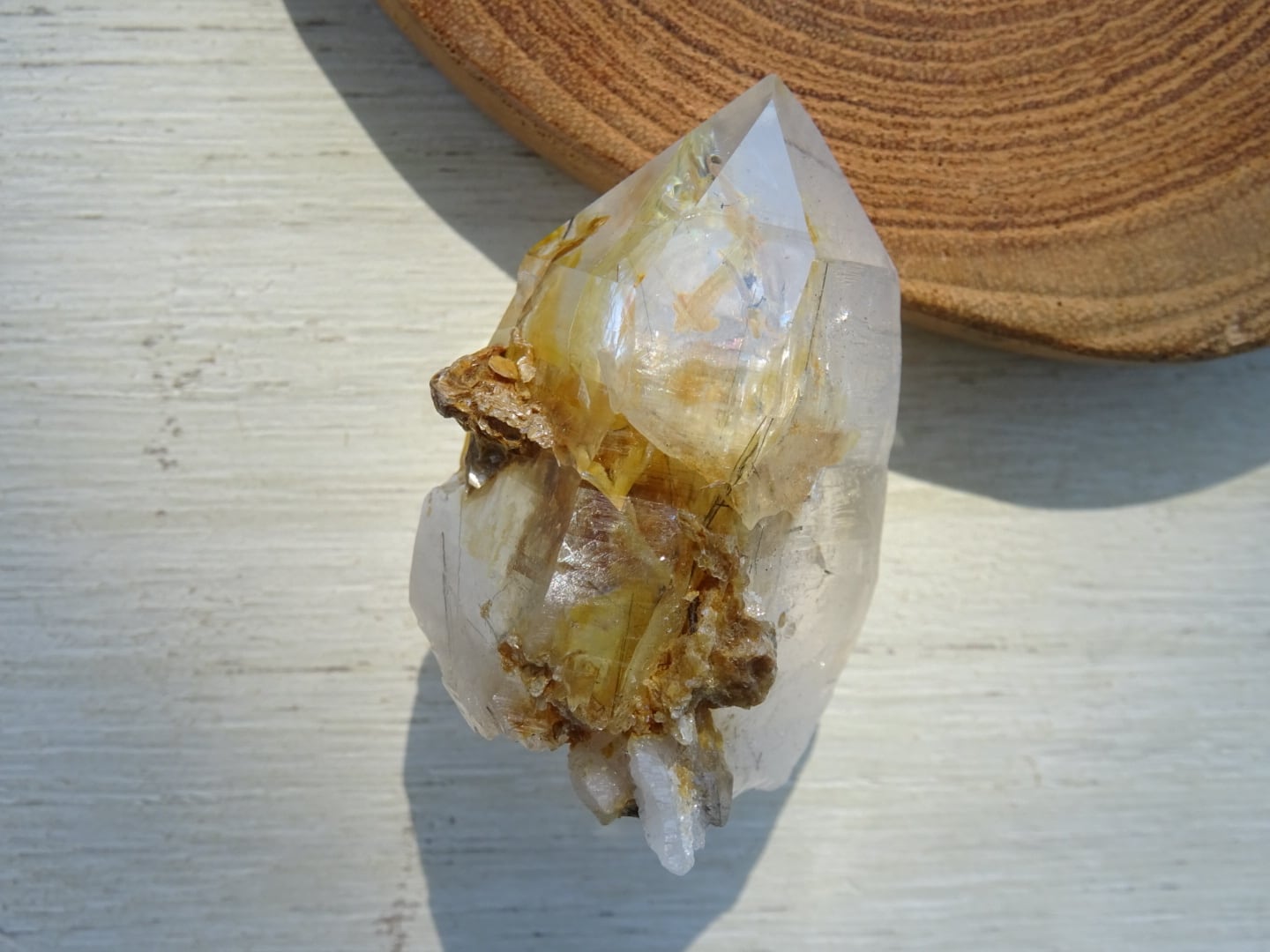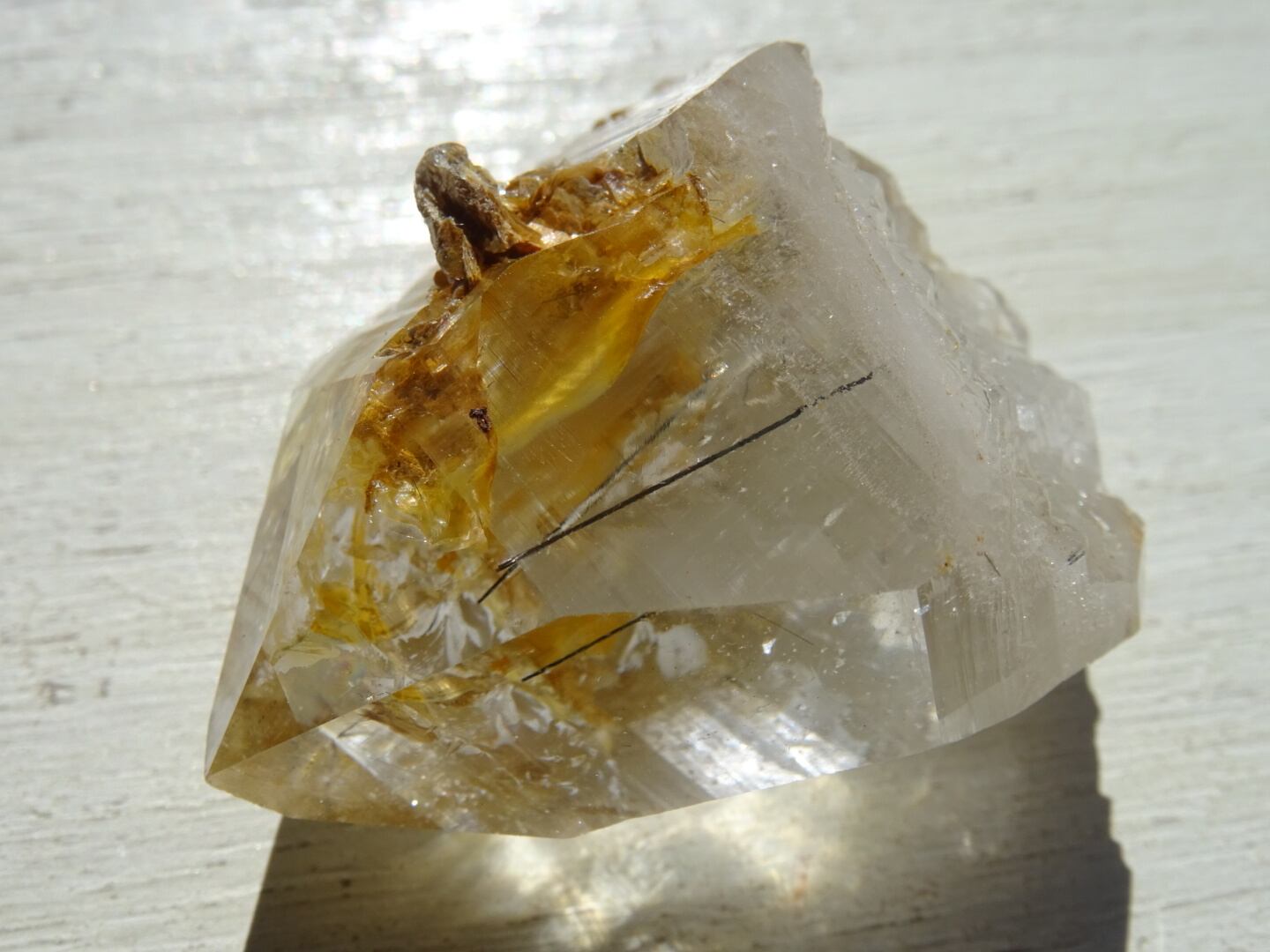 内側にゴールドのリモナイト、そしてギリリ!とまっすぐに伸びたブラックトルマリンの針を数本内包しています。金色のマイカ(雲母)の共生も。