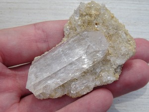 小さな結晶たちがきらきらの光の粒子を放っているホワイトの母岩の上に、まるで眠り姫のように横たえた、美しいひとつの結晶。白い姿が貝殻の中で生まれた真珠のようでもありますね。