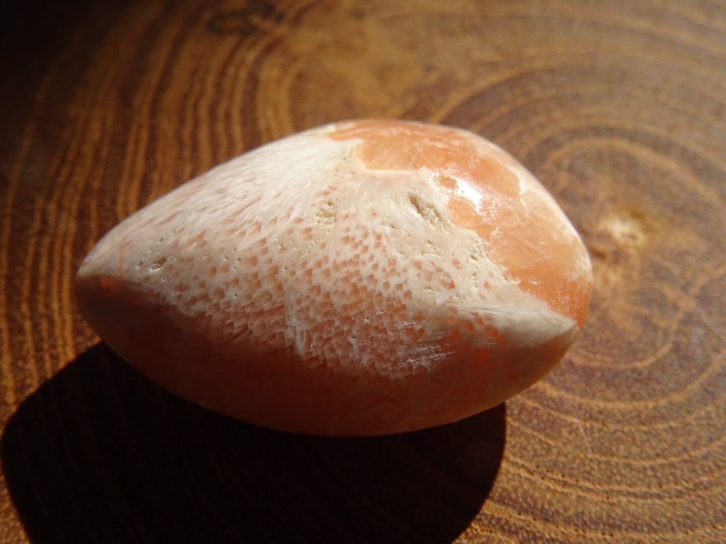月のクレーターや、翼のようなホワイトの色模様。ピンクスコレサイトは、そこにやさしいコーラルカラーが挿しています。傾けるとシラーのような光をサっと渡らせてくれるのですが、こちらは動画でご確認ください。