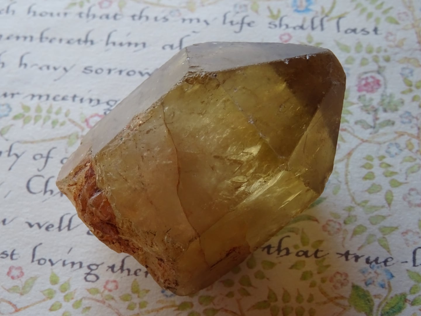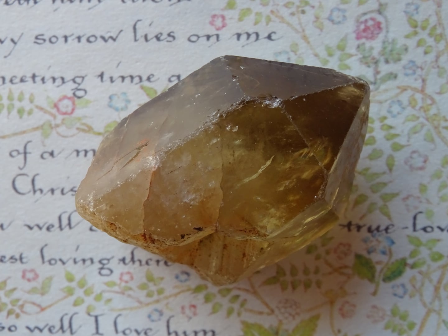 胆力と、進んでいくための灯火を携えているようなこのコンゴシトリン。ファセット部分にたくさんのファントムが出ているのですが、よく見ると中部のあたりにもホワイトインクルージョンの塊のようなファントムができていて。そのことがこの石をよりパワフルに感じさせます。