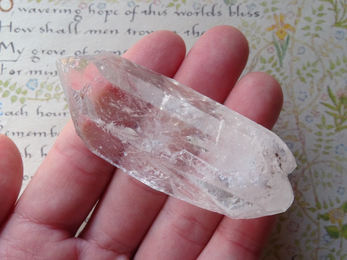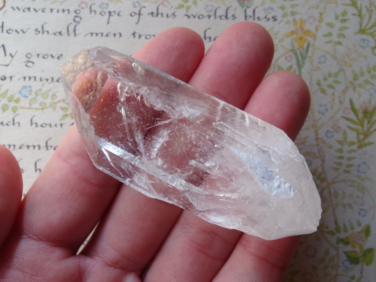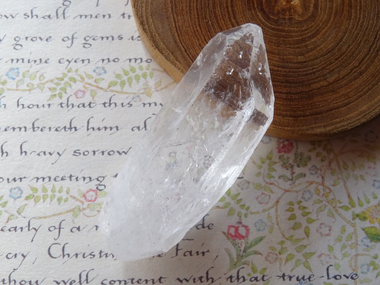 実物を手にされるとわかると思うのですが、とても艶やかな印象のクリスタルです。そしてPureで優し気。クリアなのだけど、どこか「甘い」と感じさせるようにまろやかな響きを放っています。水晶の天使、という感じでもあるかも。