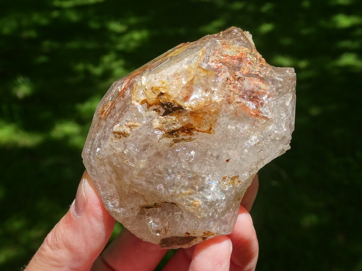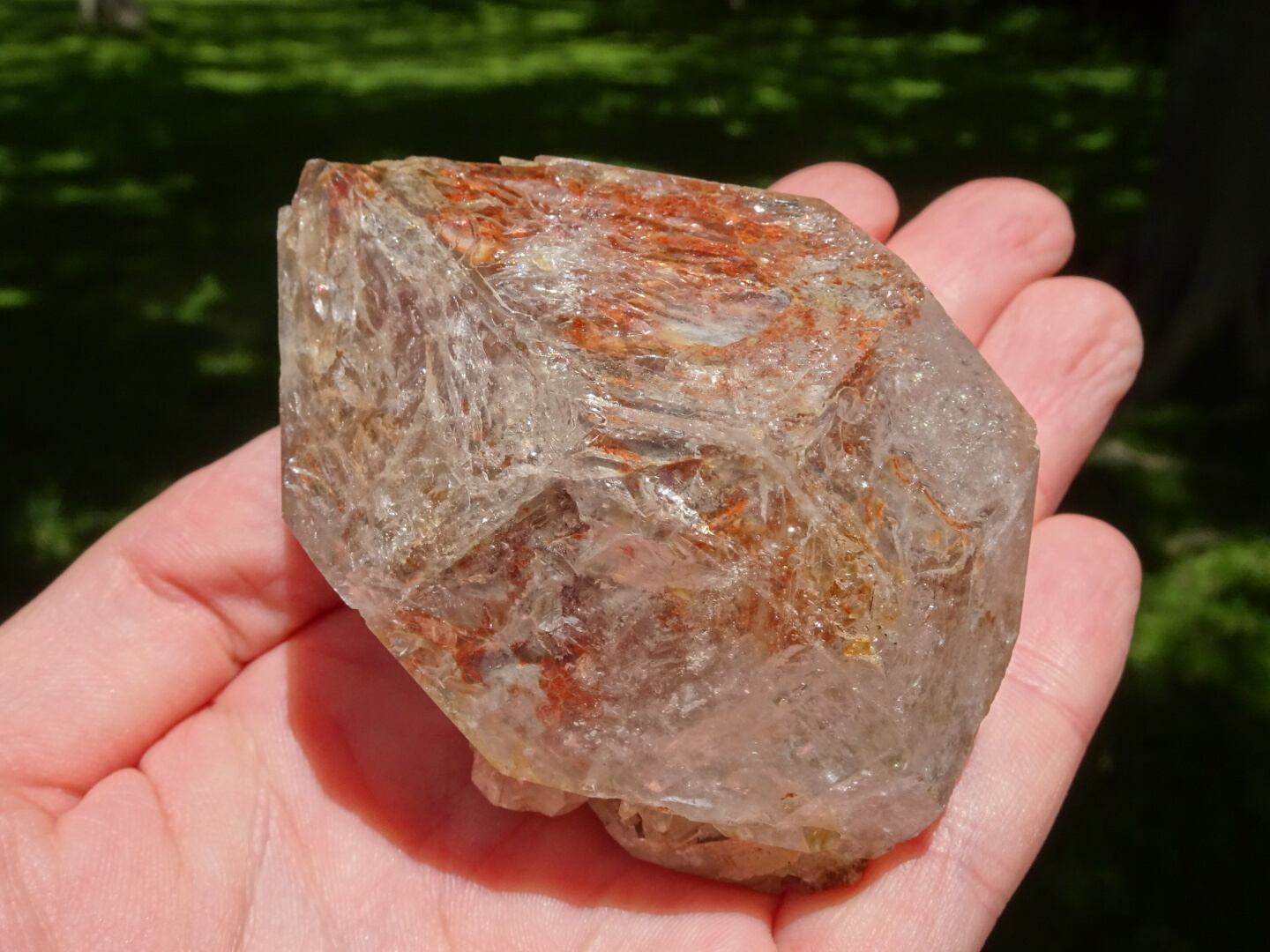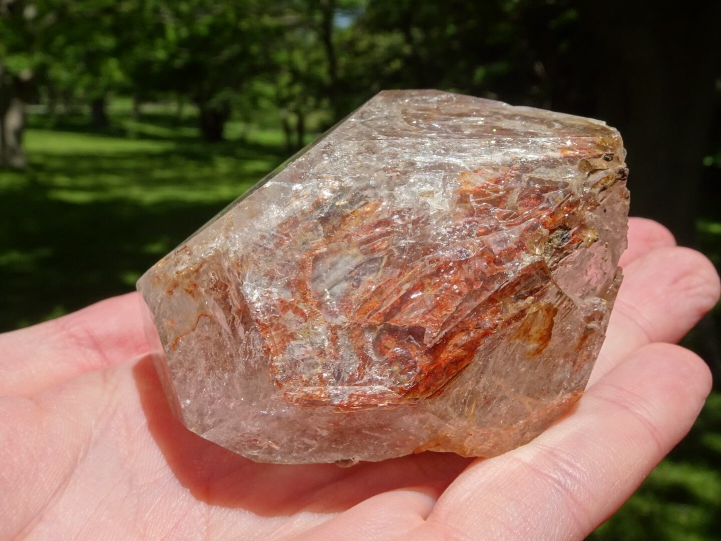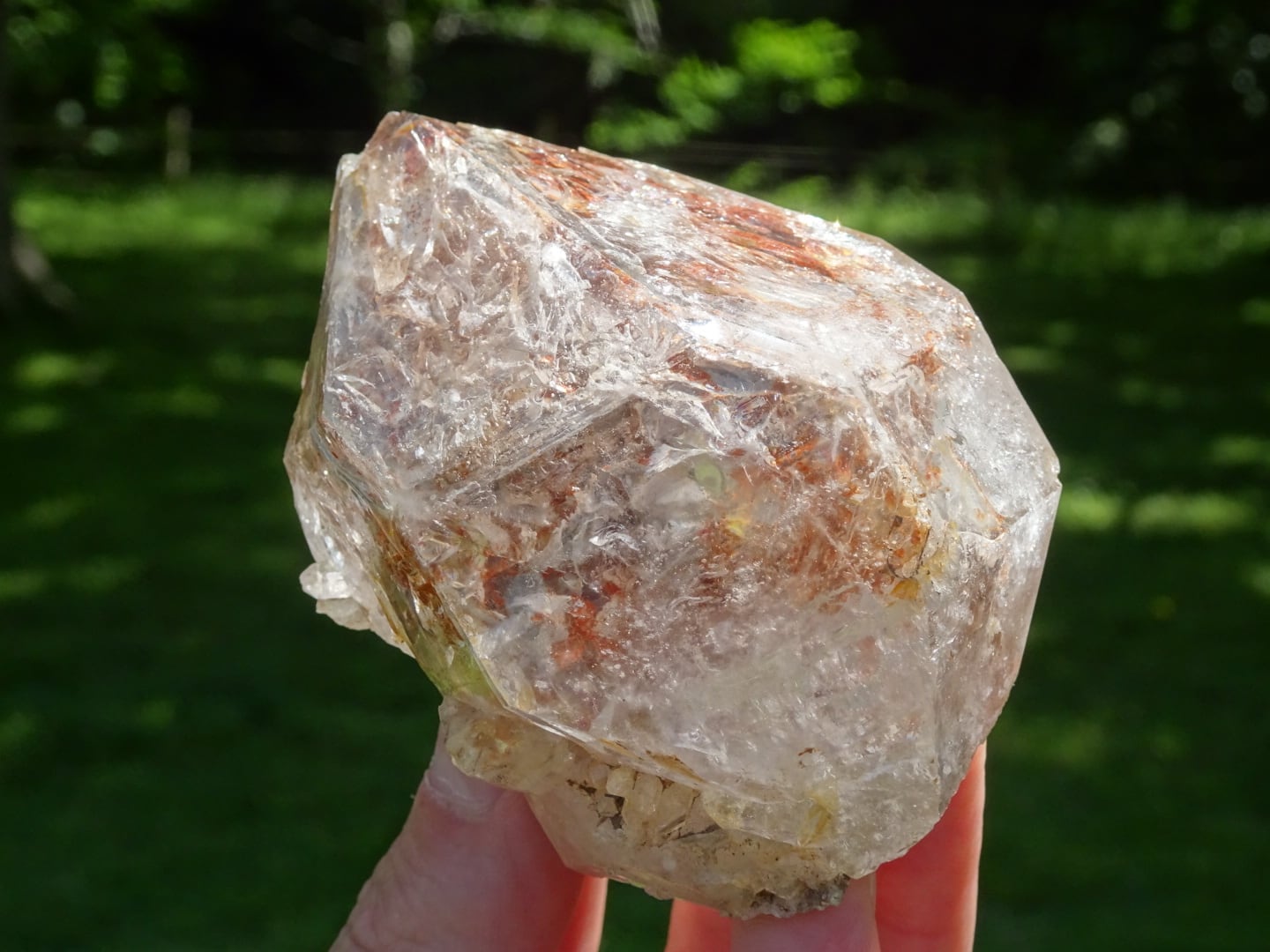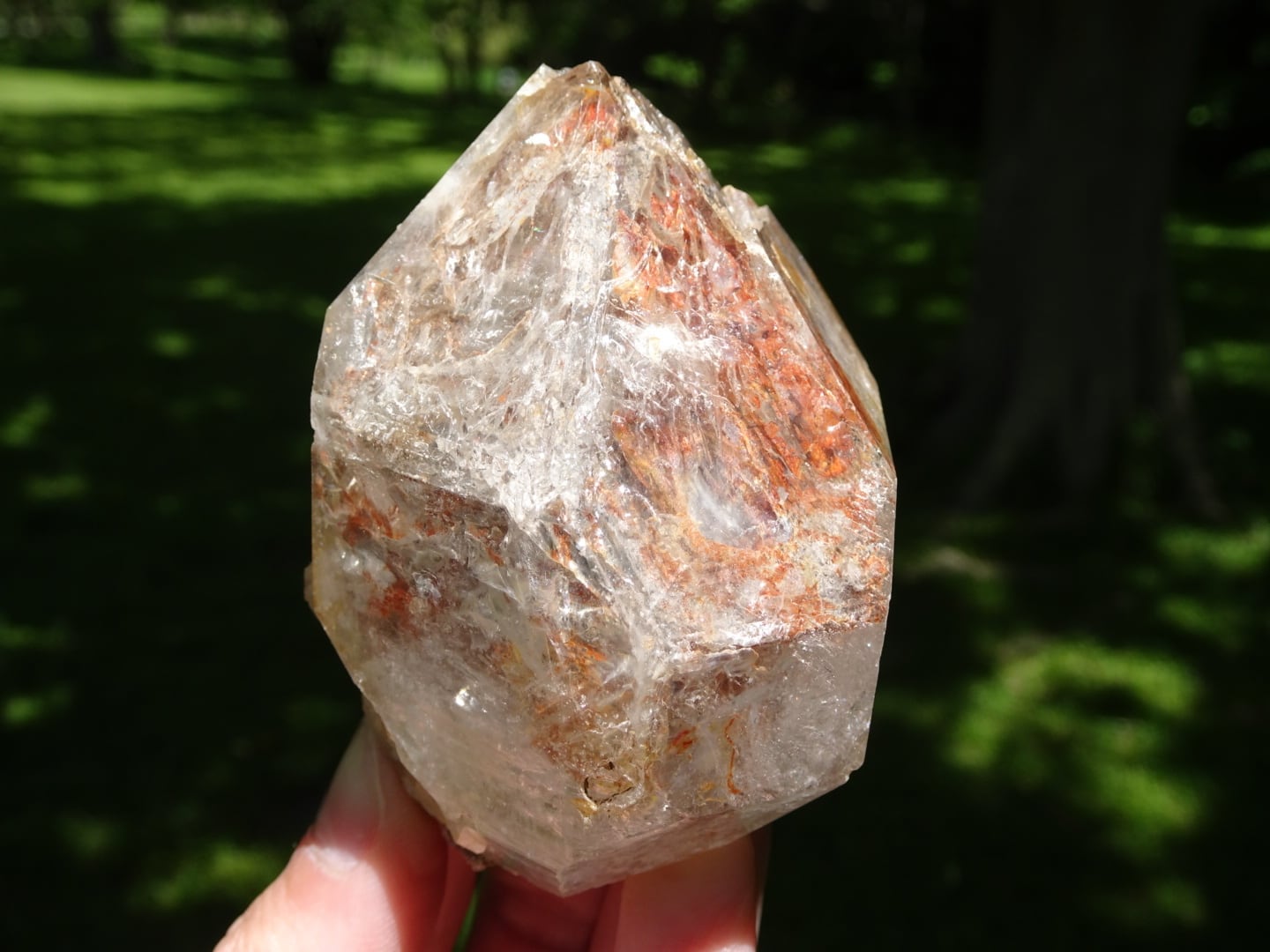 赤い鉱物はおそらくゲーサイトで、5角形のイシスフェイスや、ガラスのように透明な石肌から覗ける世界が美しいです。いくつかの面にレコードキーパーが出ています(マスターパターンだと感じる三角形も)。