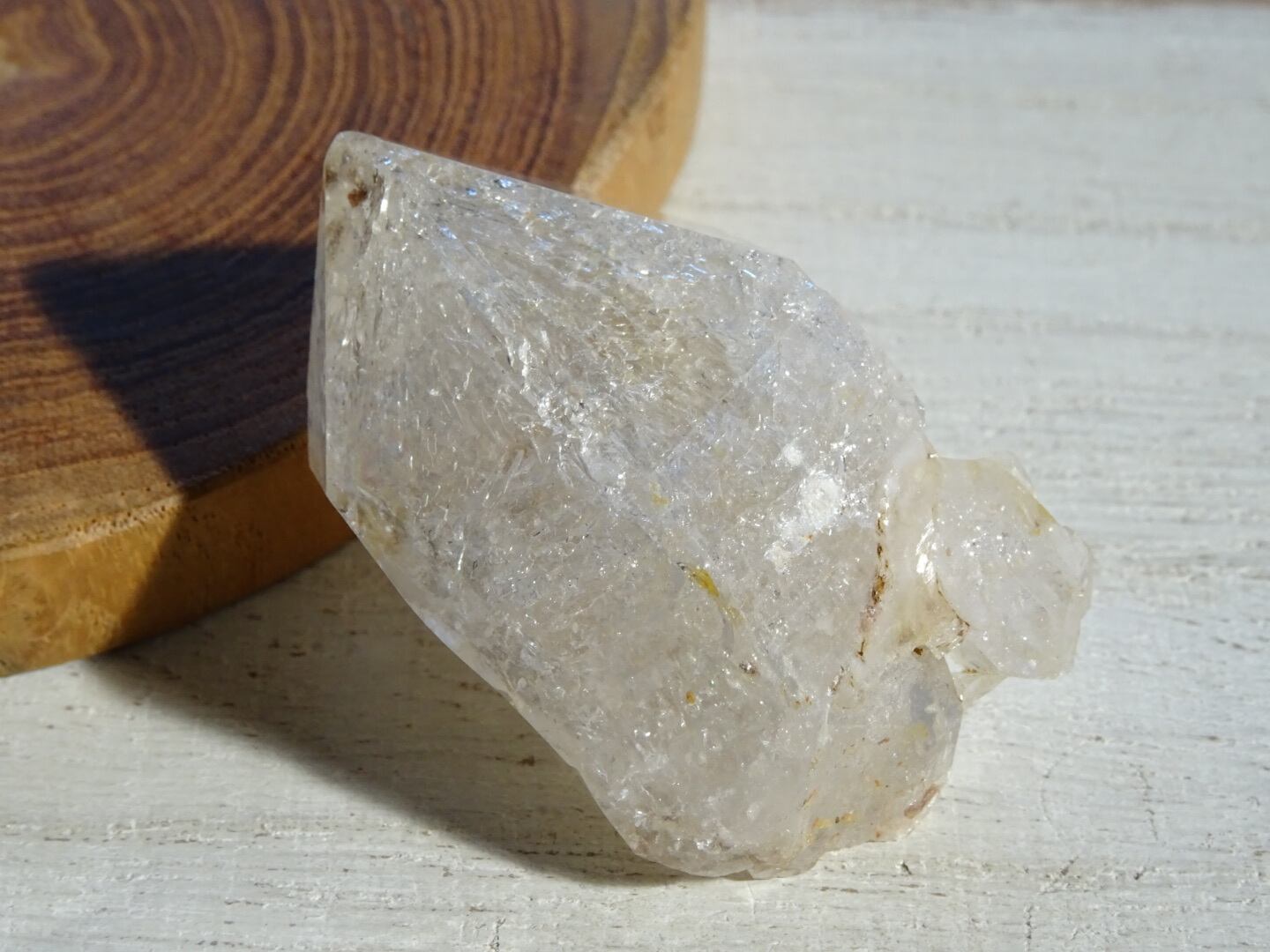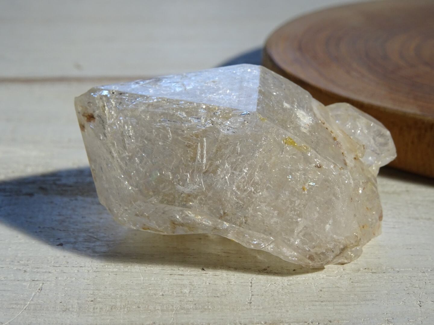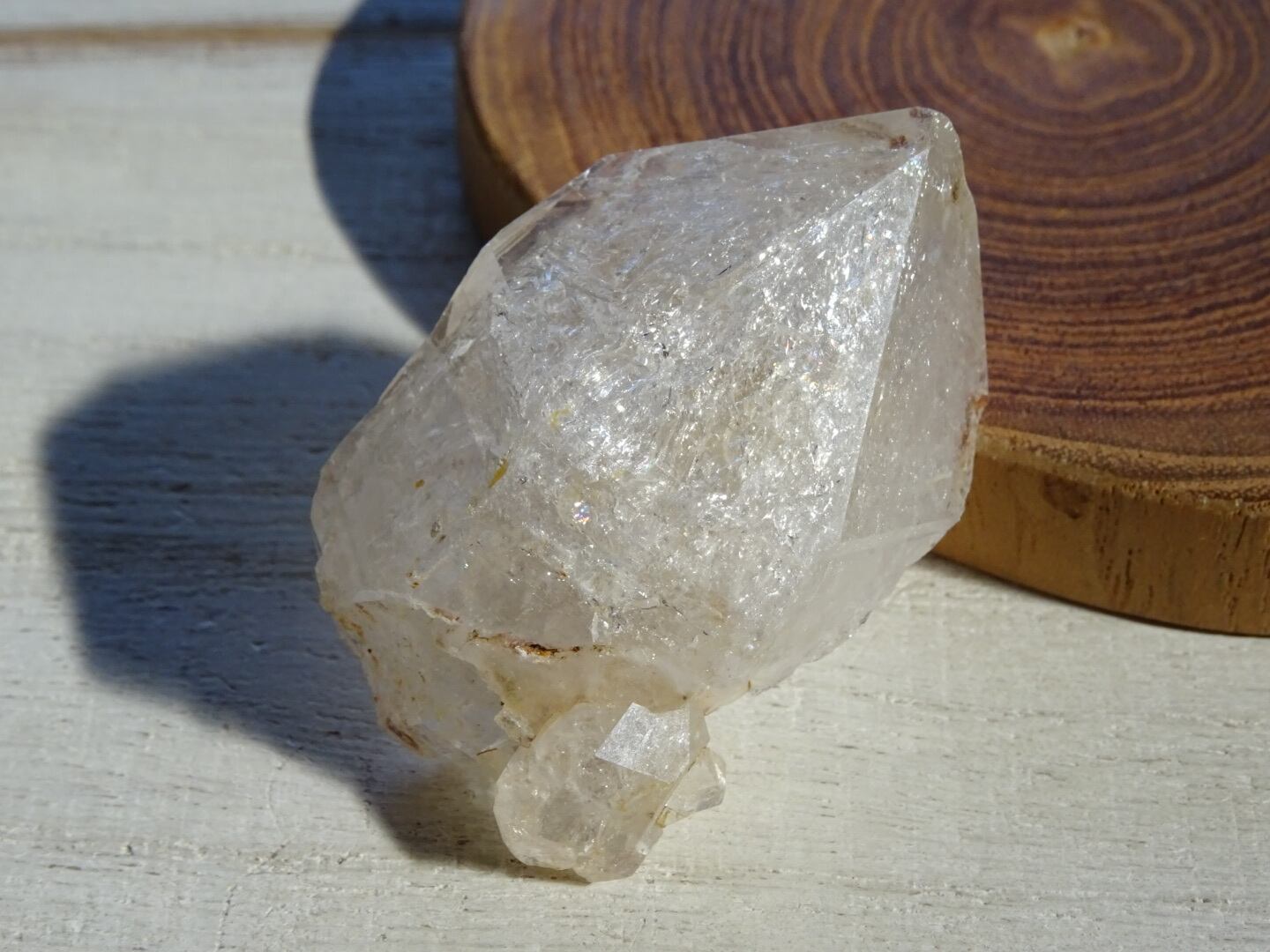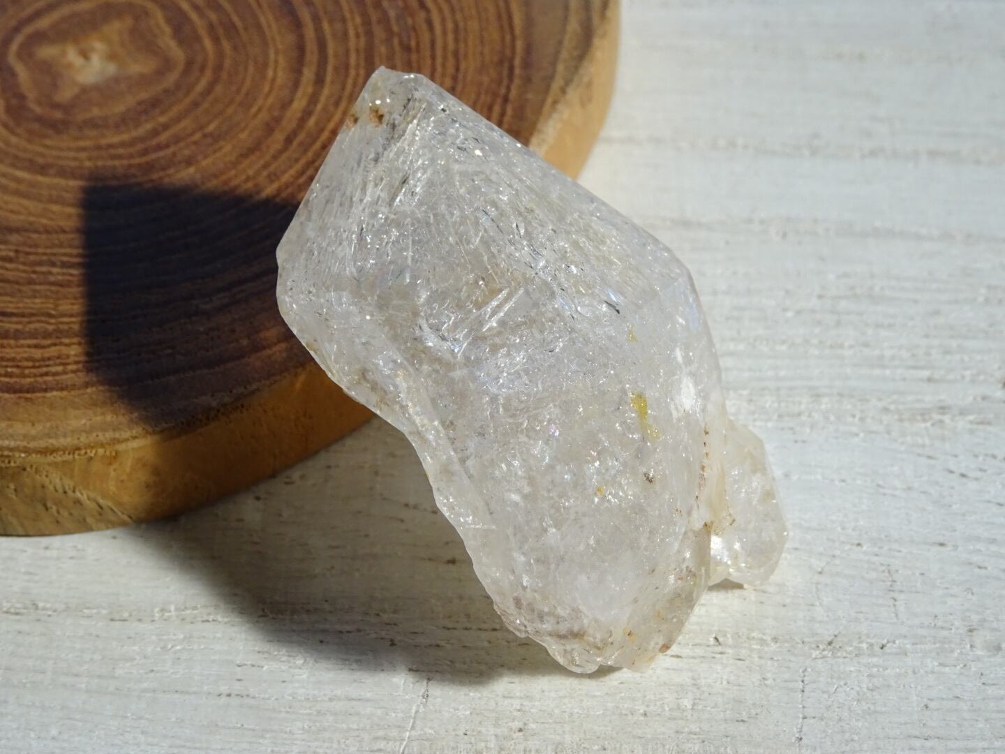 薄い氷を張り巡らせたような結晶構造、石肌の照り、きらきらで満たされているホワイトの姿、淡い虹のプリズムがとても綺麗です。