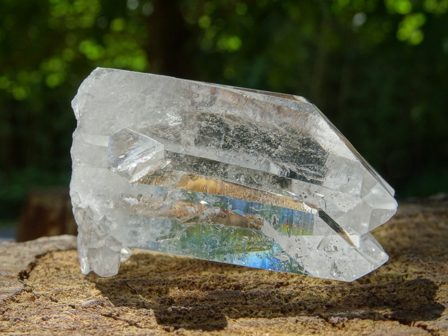 根本のクラックからは虹が、背面にはクラスターのように小さな結晶たちが共生しています。